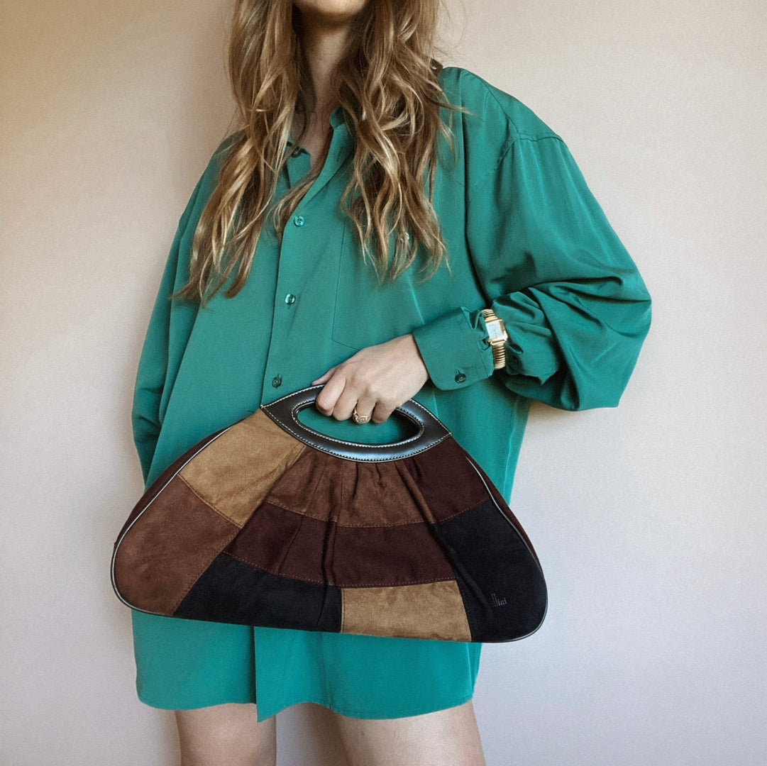 Details: Unique baguette style patchwork bag, button closure with multiple zipper compartments inside