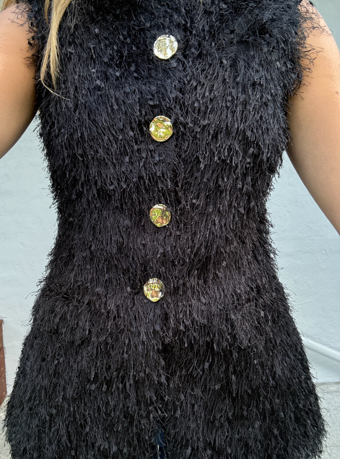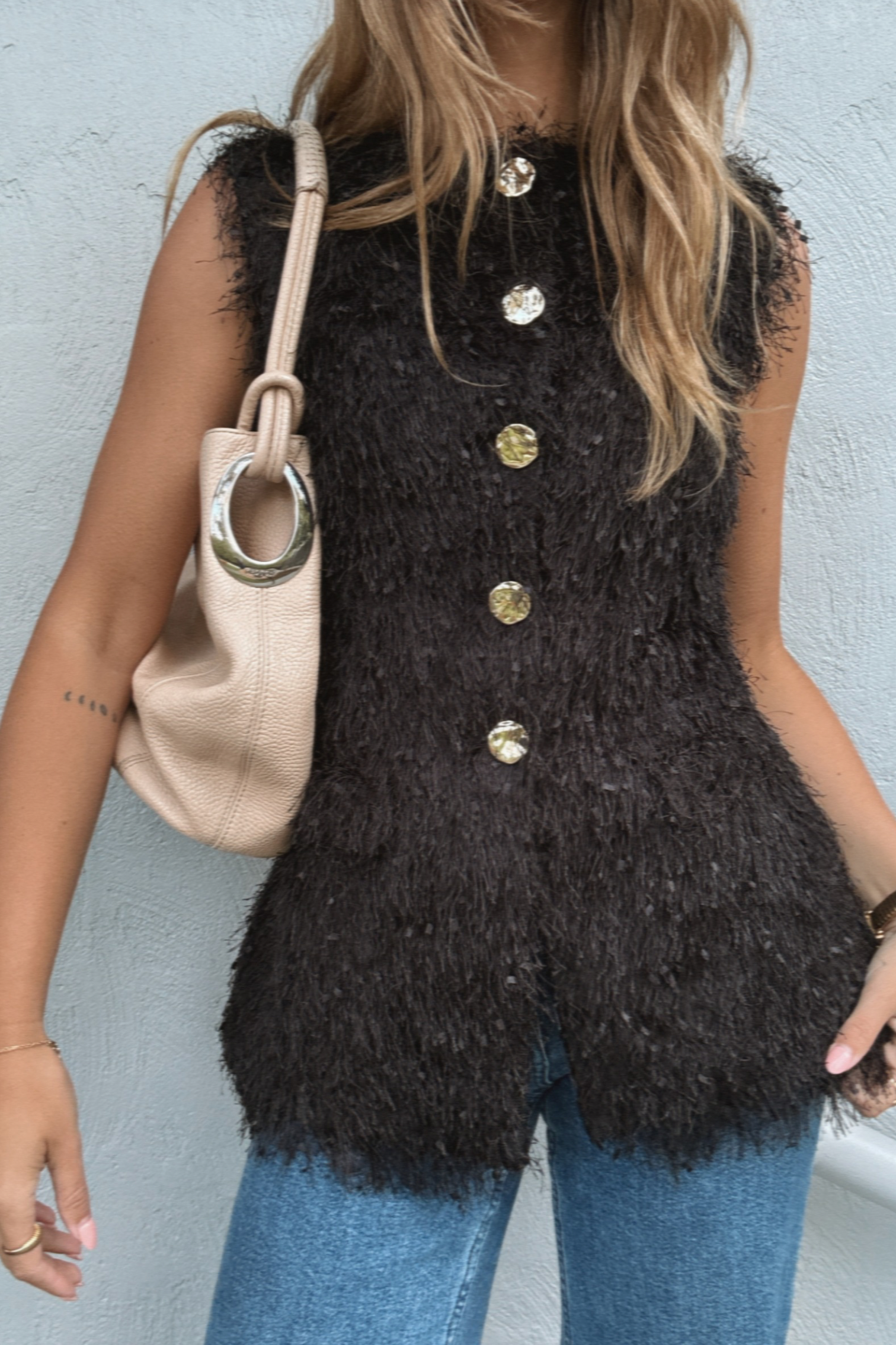 Details: The Grace Top in Feather Knit Black is designed for the feminine yet modern woman. Cut in a unique feathered fabrication, which is contrasted yet complimented by textured gold buttons down the center front. Fully lined with faux flap pockets at front. RRP: $650