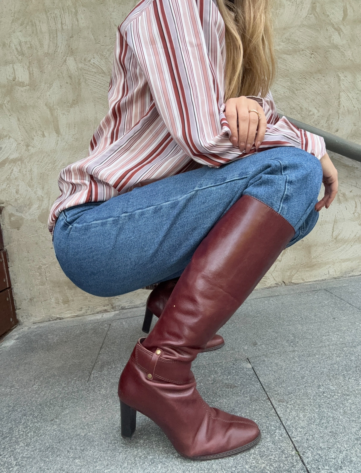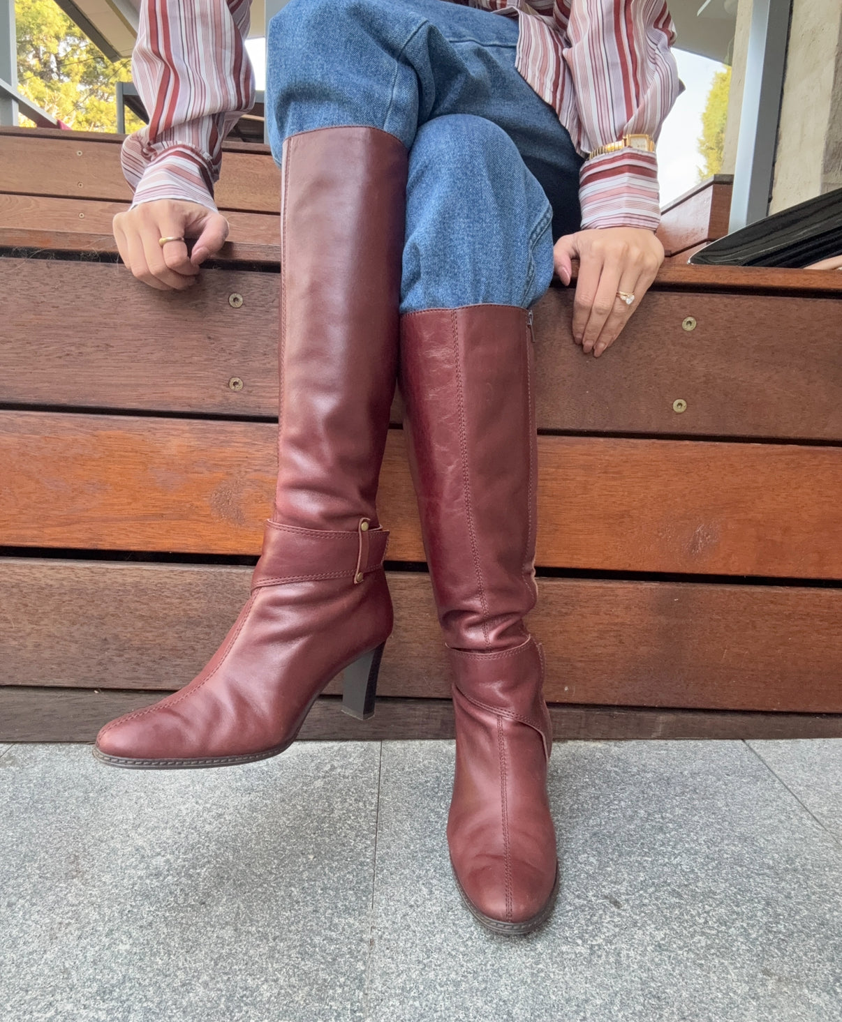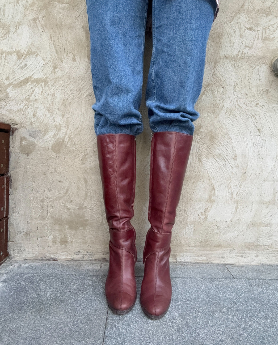Details: Statement boots in the most stunning deep burgundy leather. These knee-highs feature a softly curved toe, stacked block heel, and subtle brass hardware detailing at the ankle. Full side zip for easy wear and a sleek, contoured shape that works perfectly styled over denim or under long skirts.