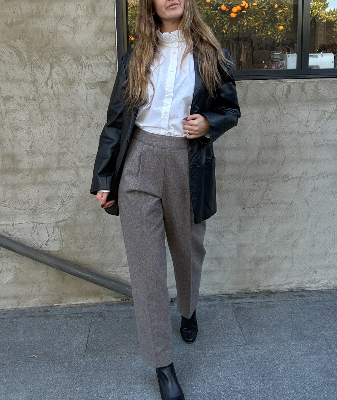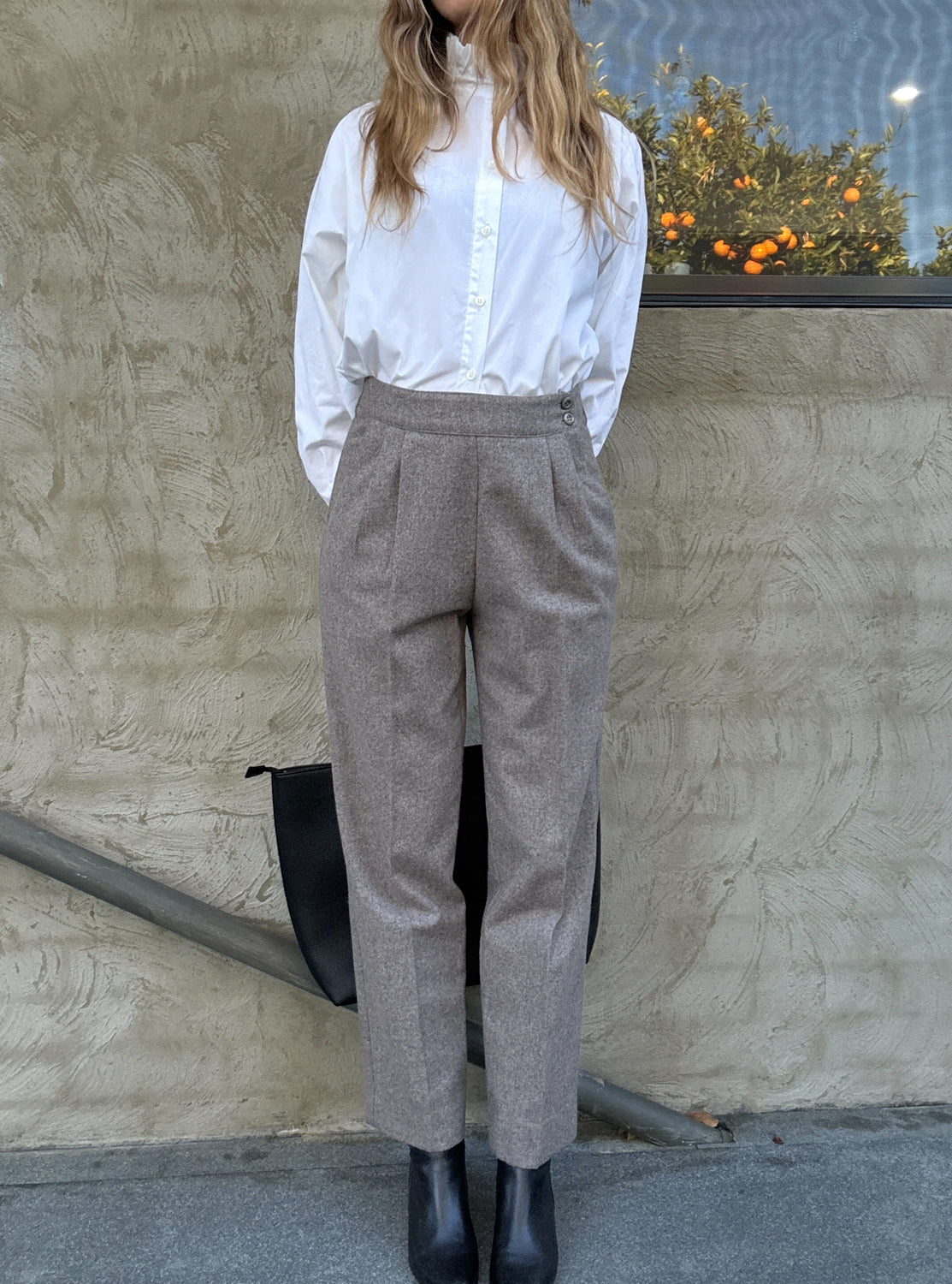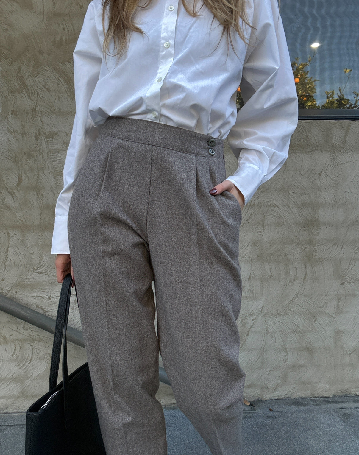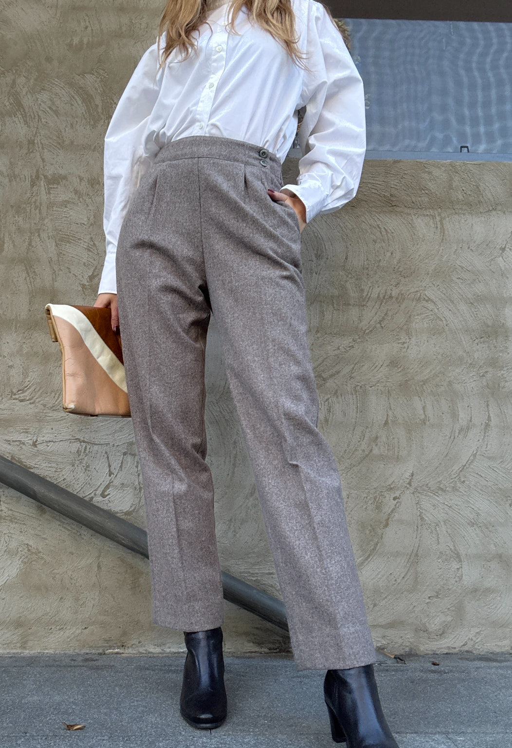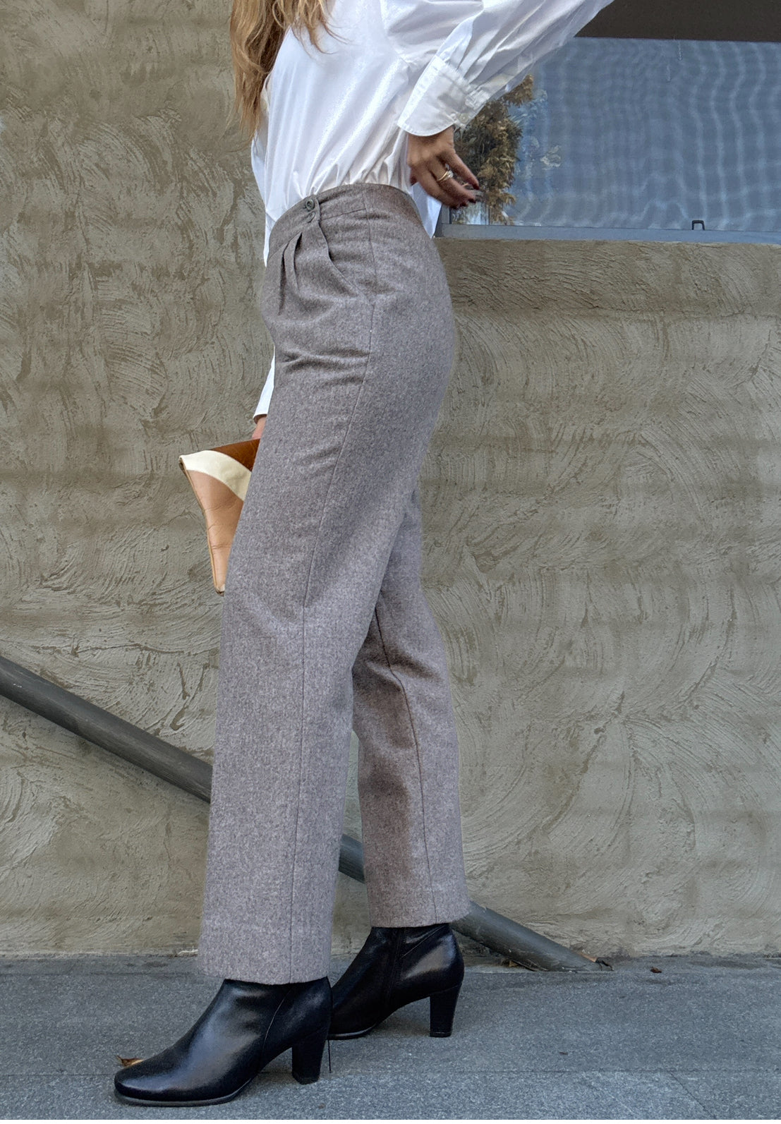 Details: Classic tailored wool trousers in a soft grey marle. High waisted with pleated front detail and a flattering tapered leg. Pair beautifully with crisp shirting or layered knits for that effortless vintage minimalist look.