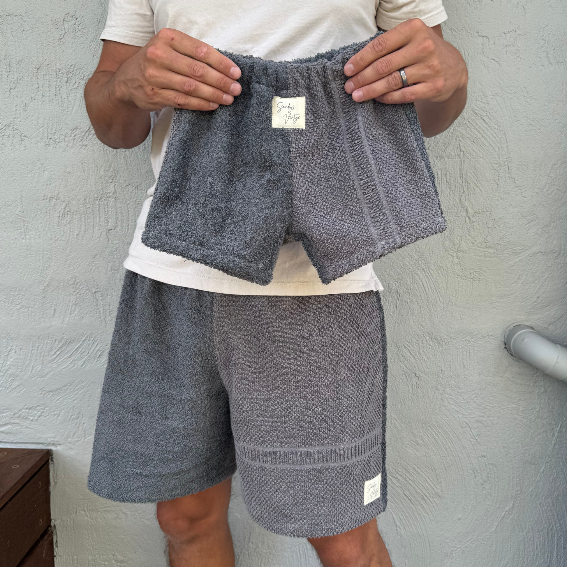 Each pair is thoughtfully cut and sewn in my Melbourne home studio, using carefully selected vintage and preloved towelling — fabrics chosen for their softness, durability, and lived-in feel. From sourcing to stitching, every towel is used as fully as possible, with leftover scraps transformed into matching bags, hats, and accessories to minimise waste.