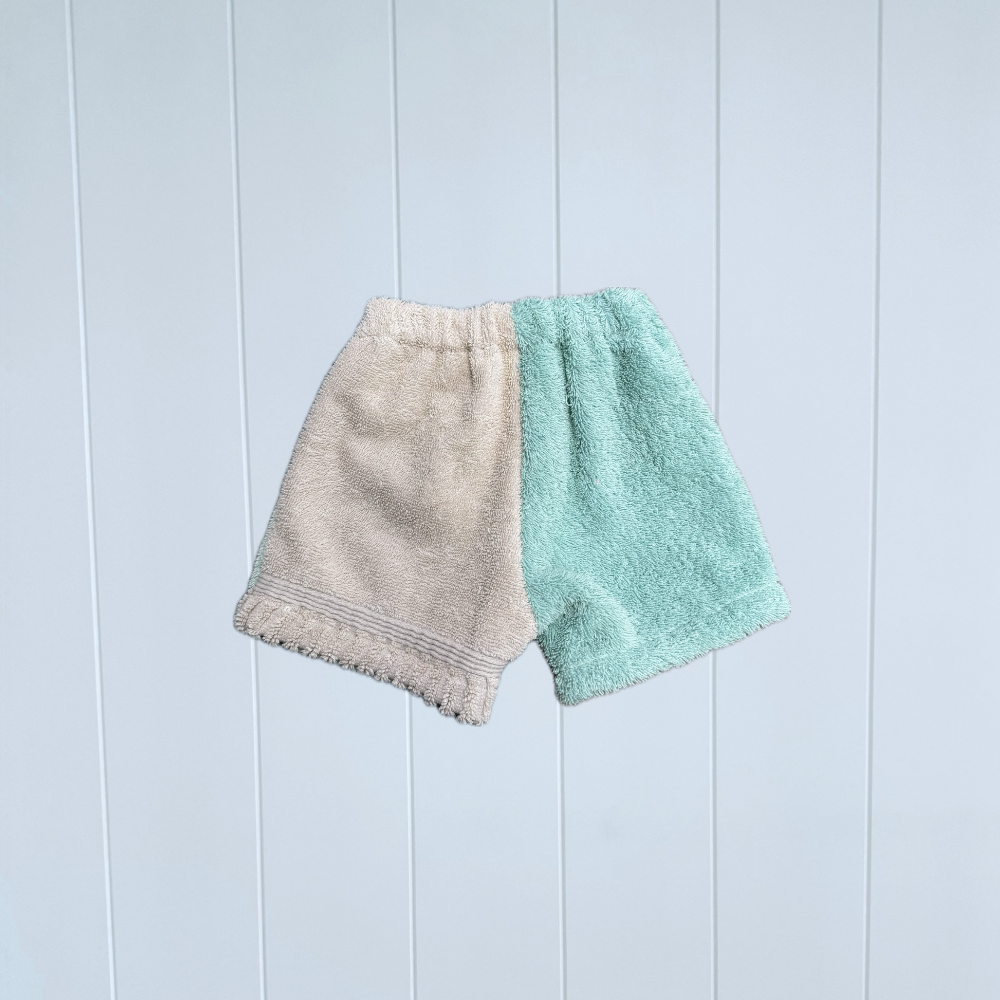 Each pair is thoughtfully cut and sewn in my Melbourne home studio, using carefully selected vintage and preloved towelling — fabrics chosen for their softness, durability, and lived-in feel. From sourcing to stitching, every towel is used as fully as possible, with leftover scraps transformed into matching bags, hats, and accessories to minimise waste.