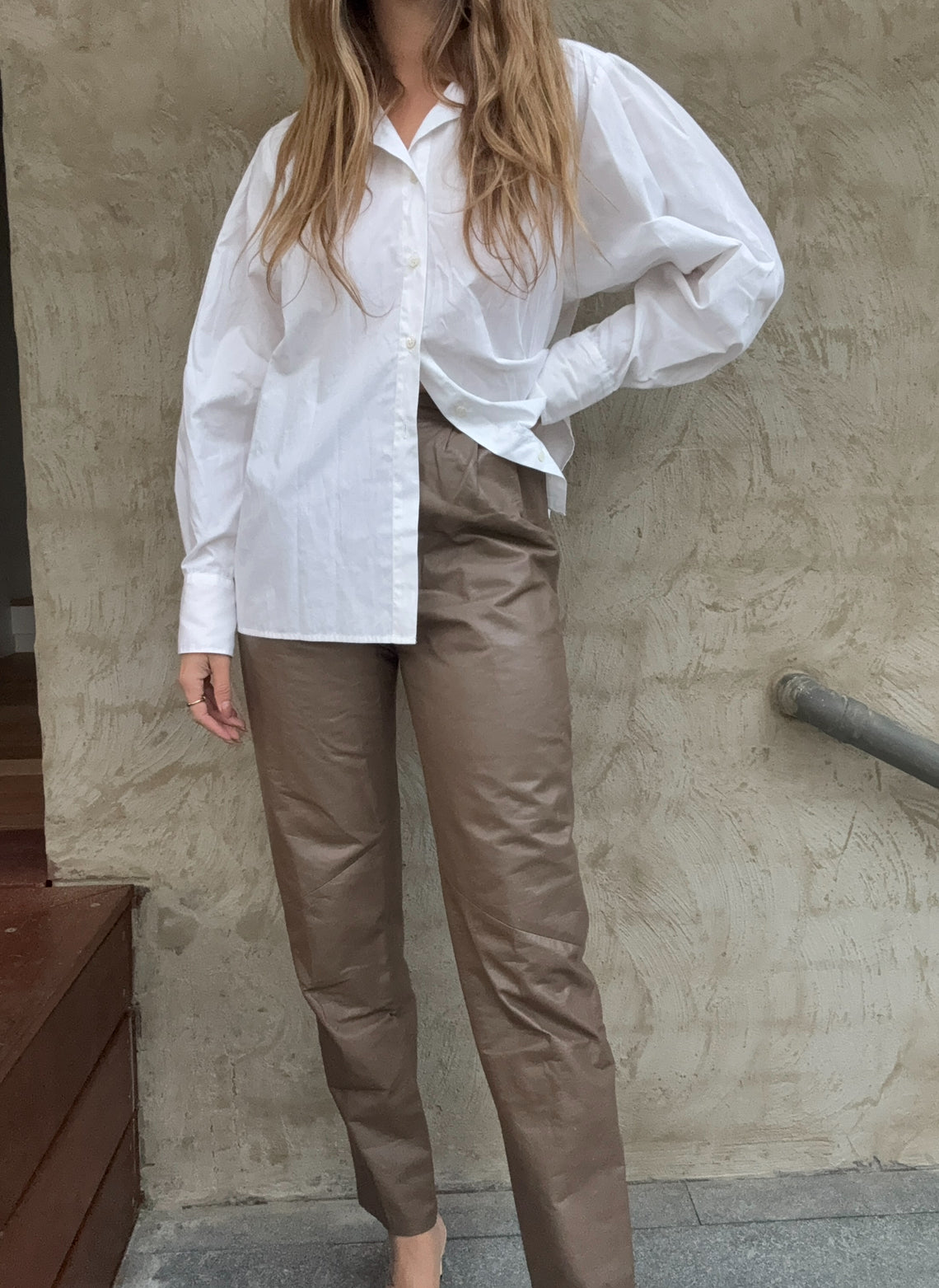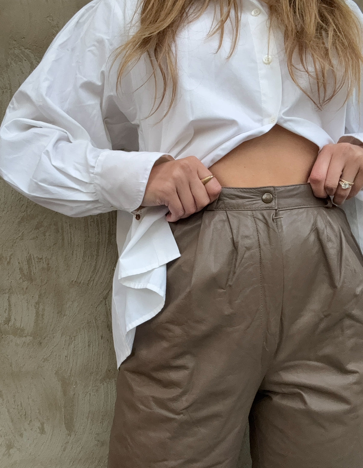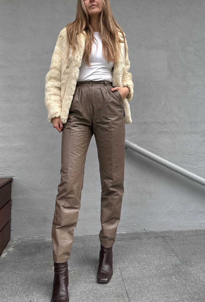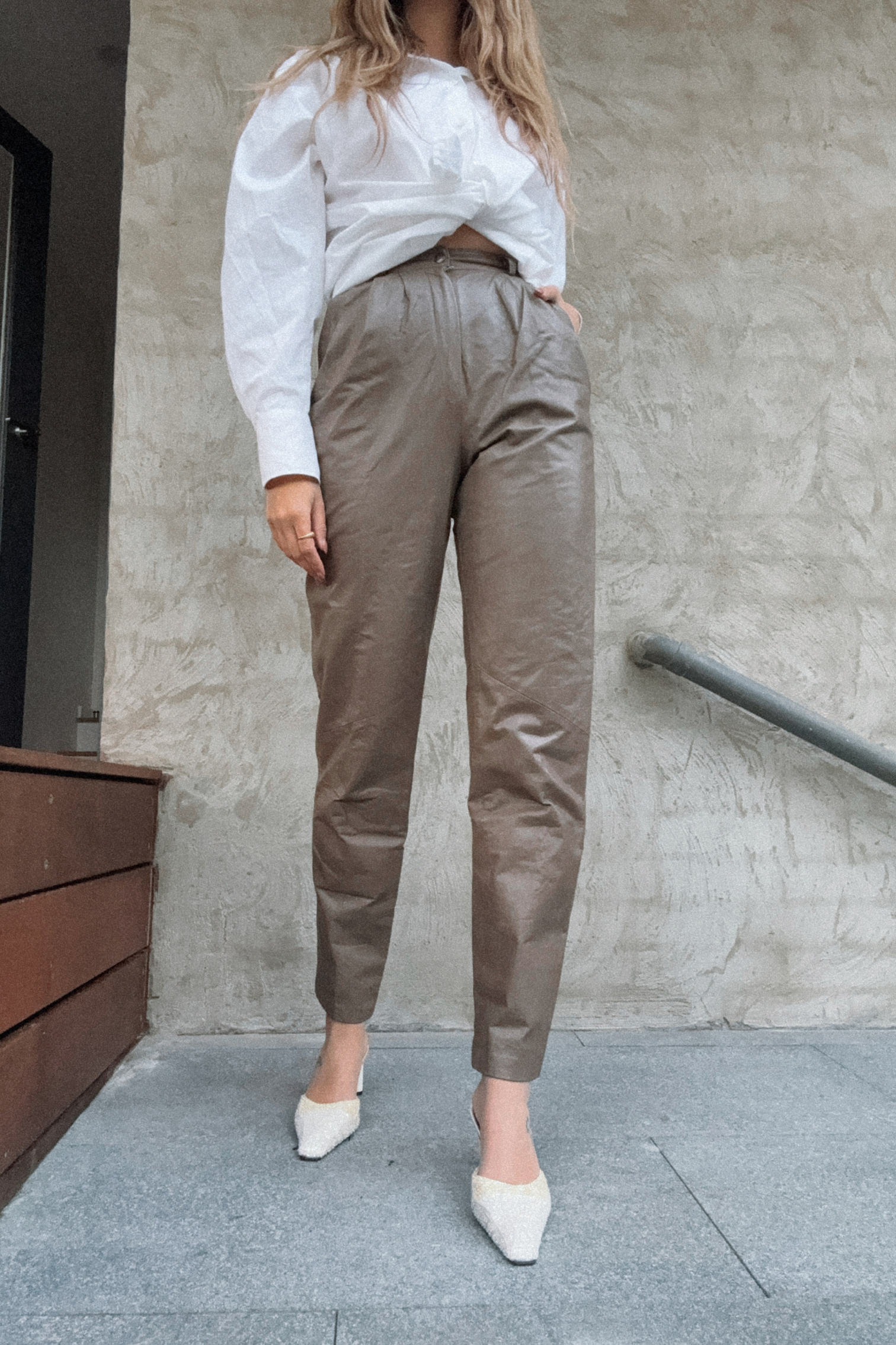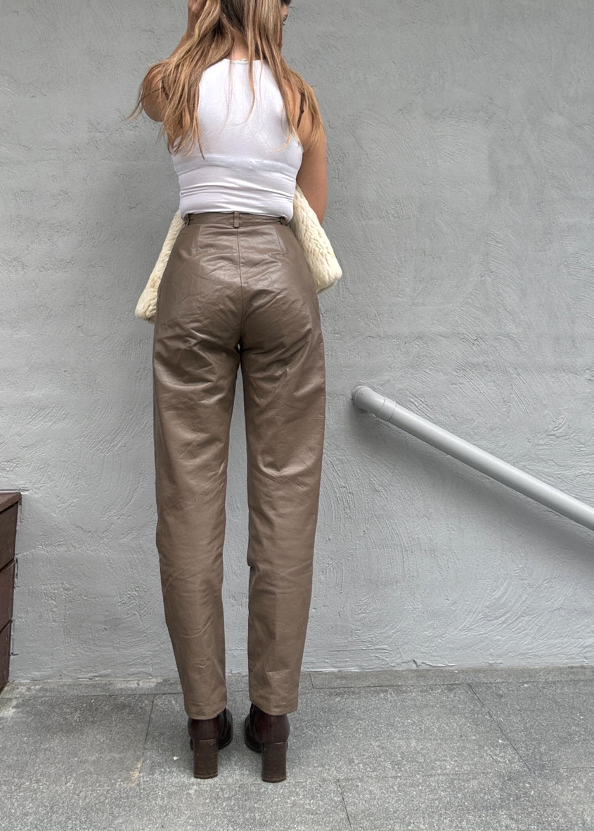 Details: Vintage high-waisted leather trousers in a rich taupe tone. Featuring soft pleat detailing and a tapered leg for a structured yet flattering silhouette. Style with crisp shirting or chunky knits to channel timeless, understated edge.