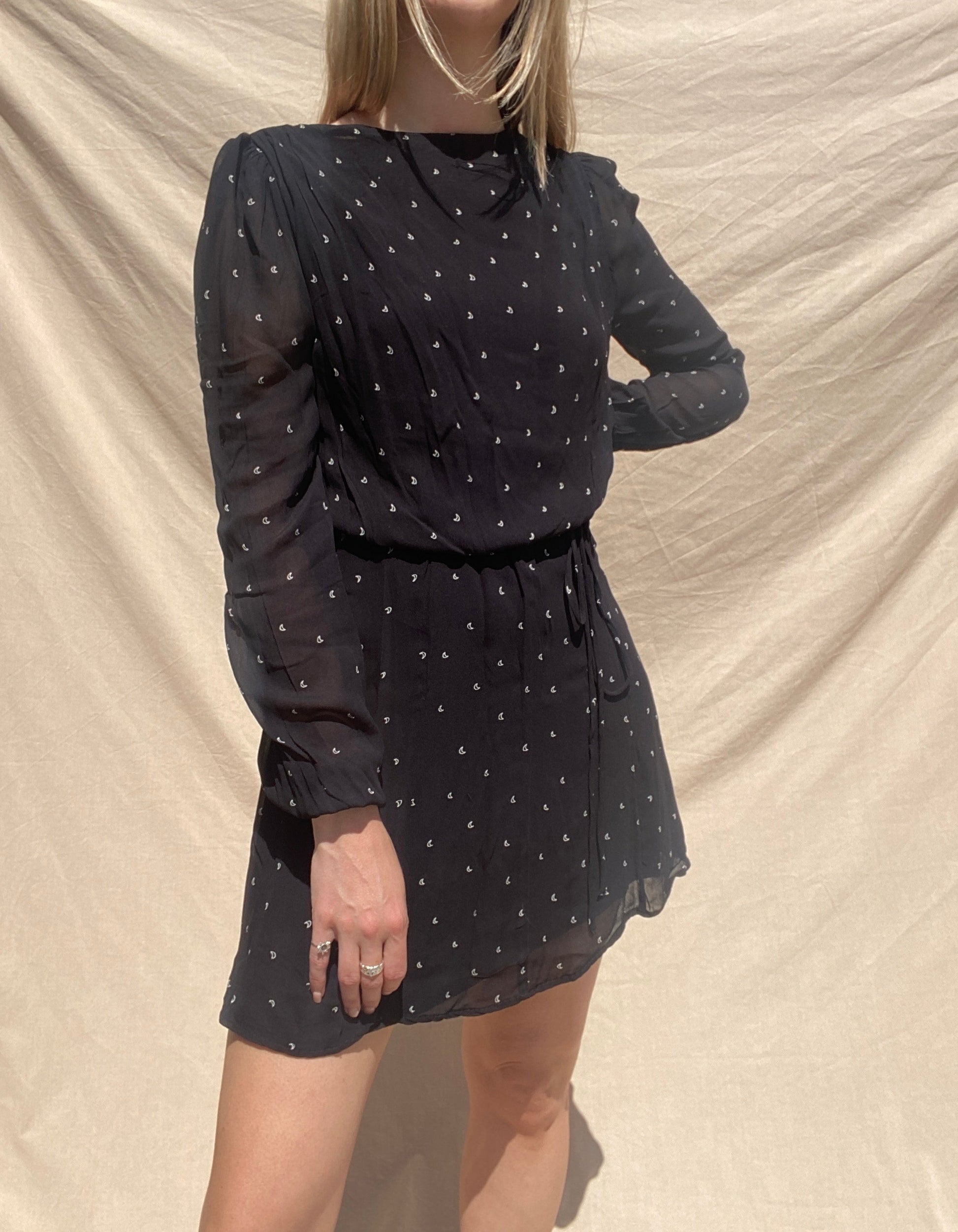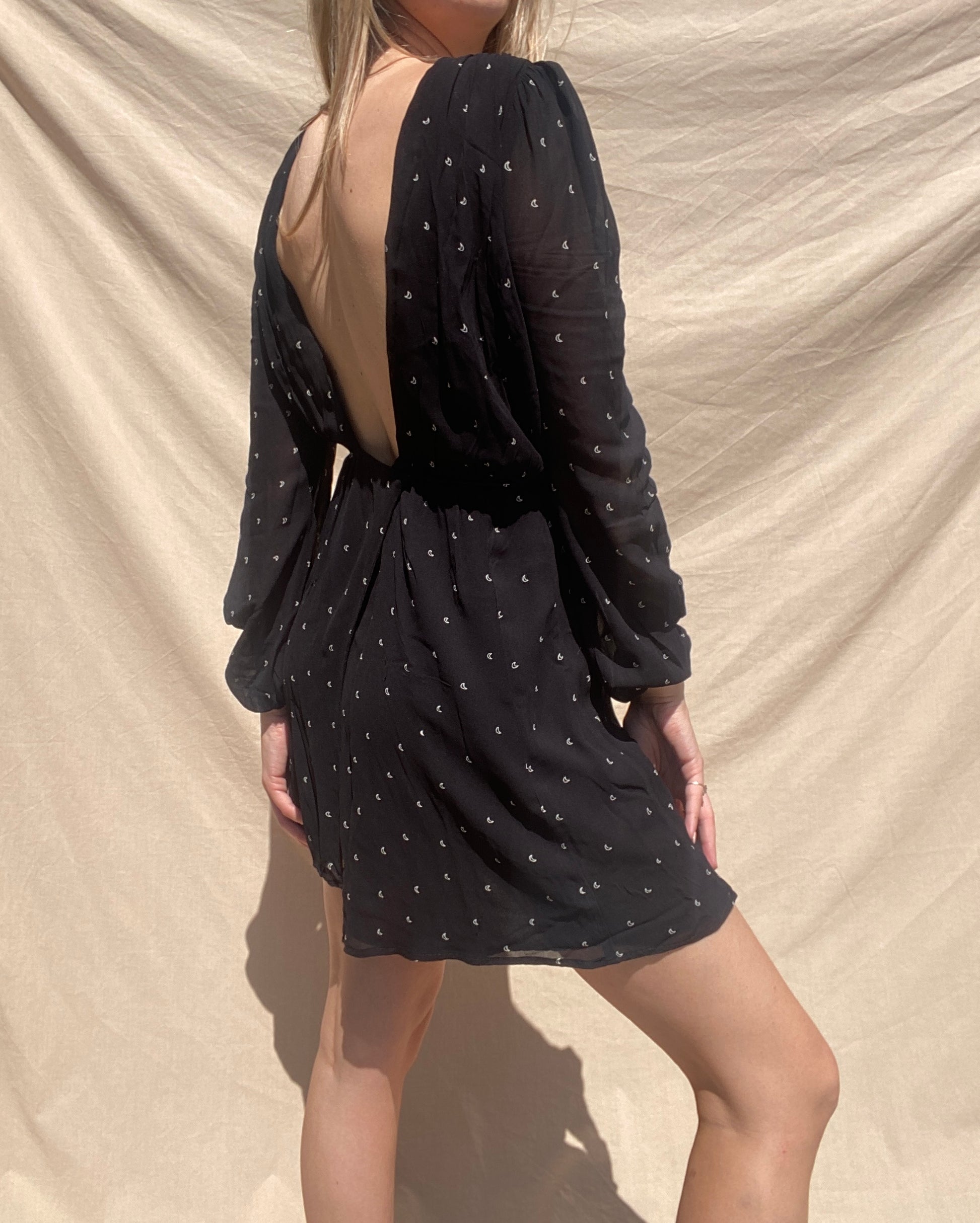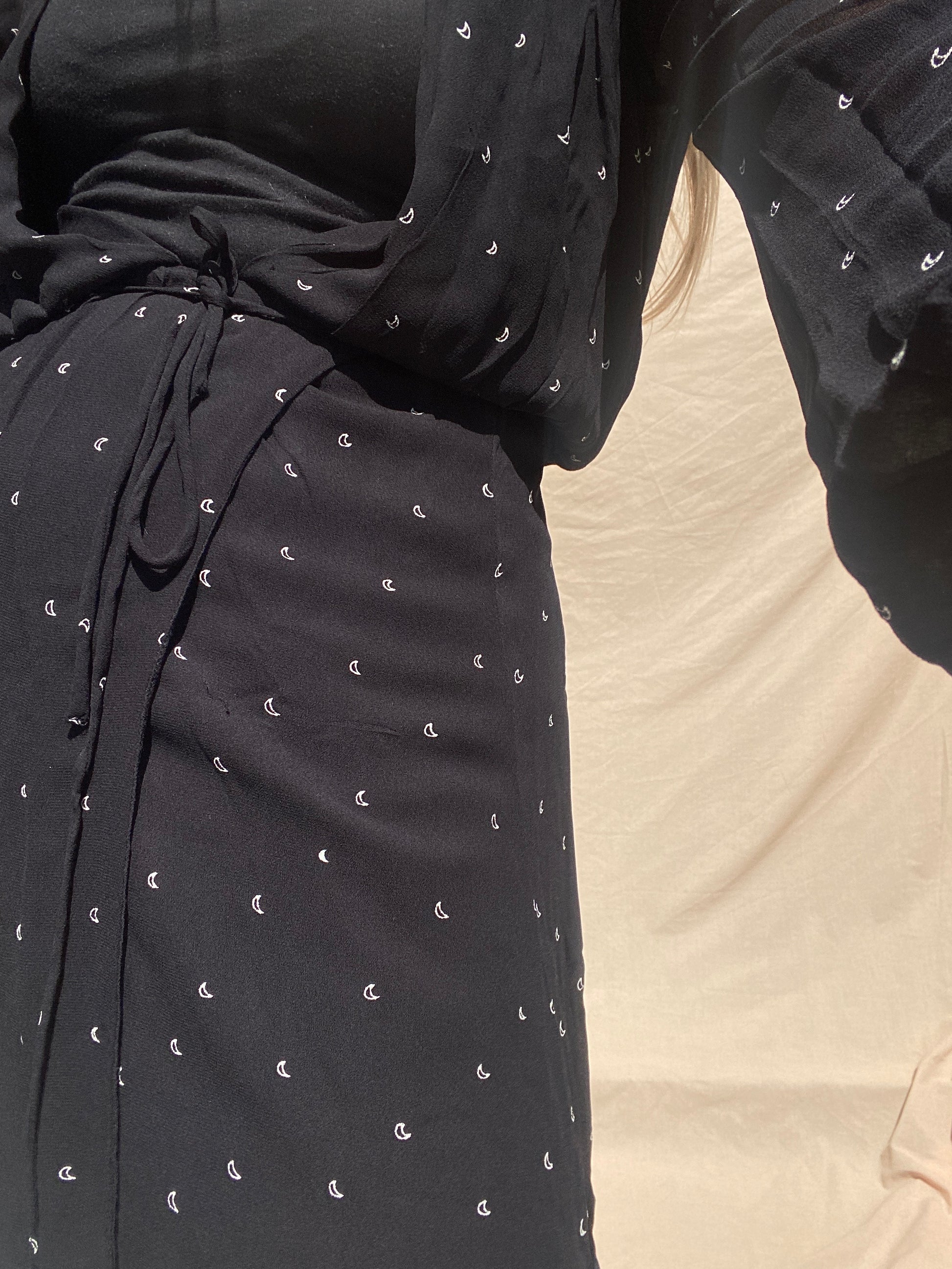 Black and white moon print wrap dress by Reformation. V-neck, tonal stitching and tie closure at waist.