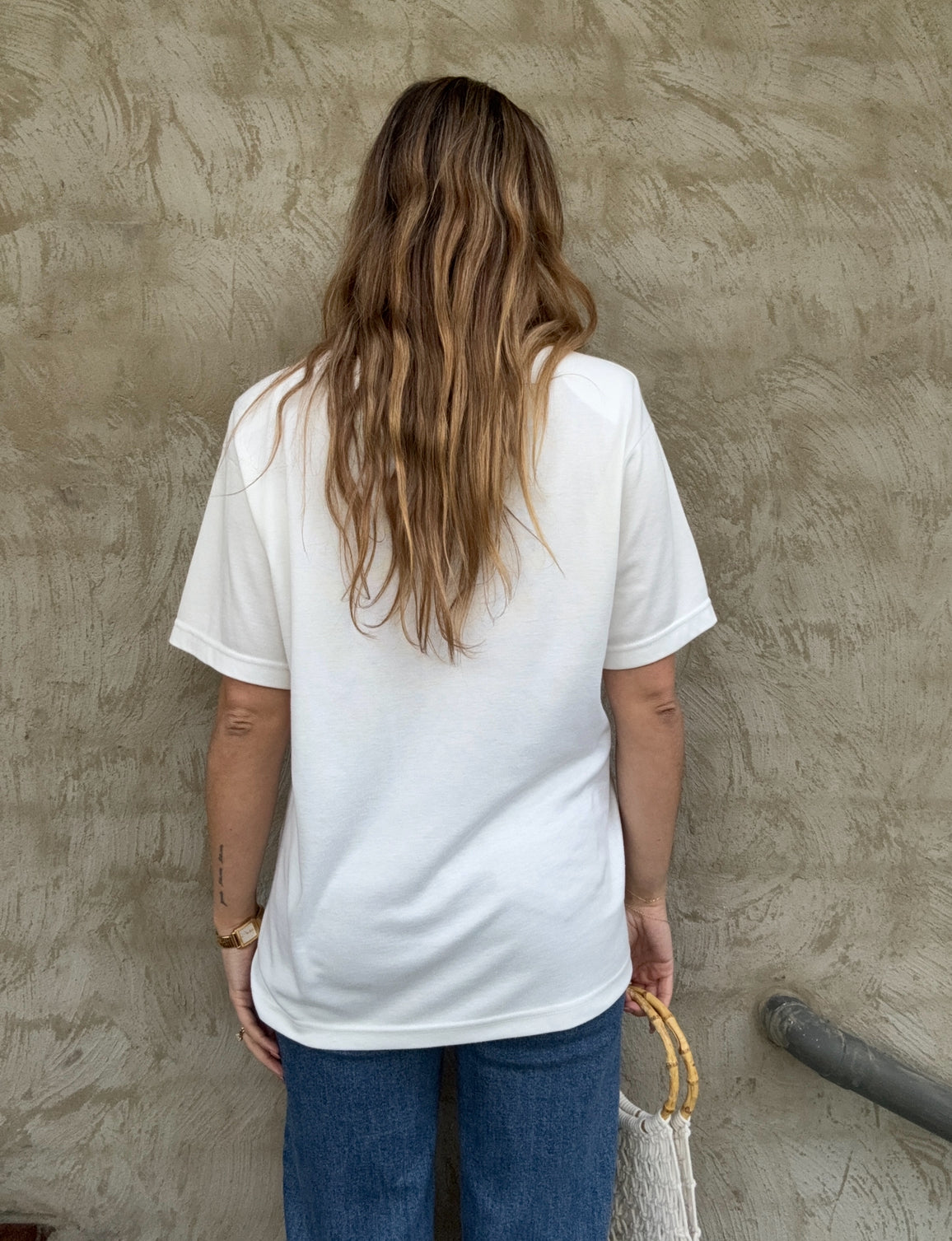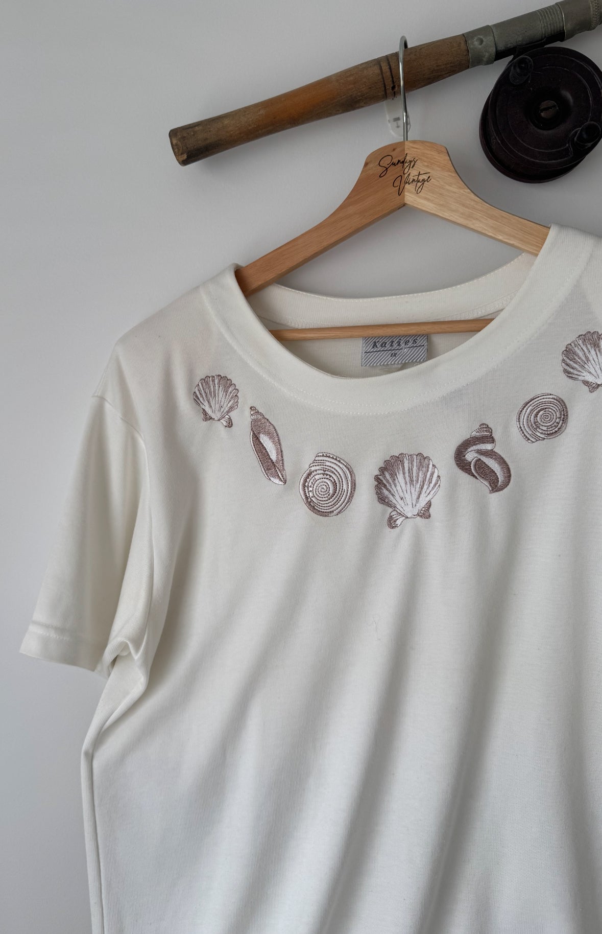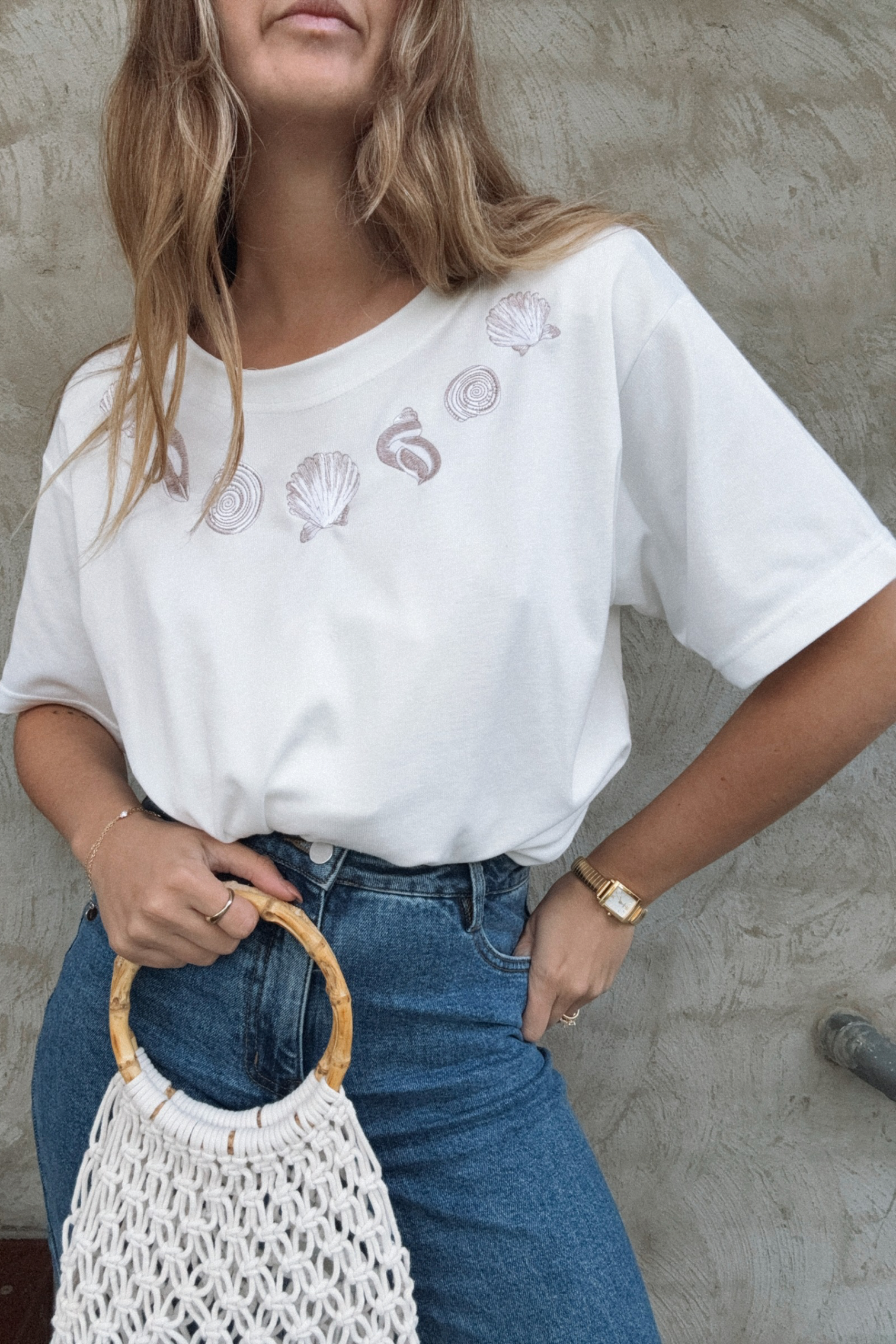 Details: Soft classic white tee with the sweetest shell embroidery around the neckline. Relaxed fit with subtle shoulder pads that can easily be removed if preferred.