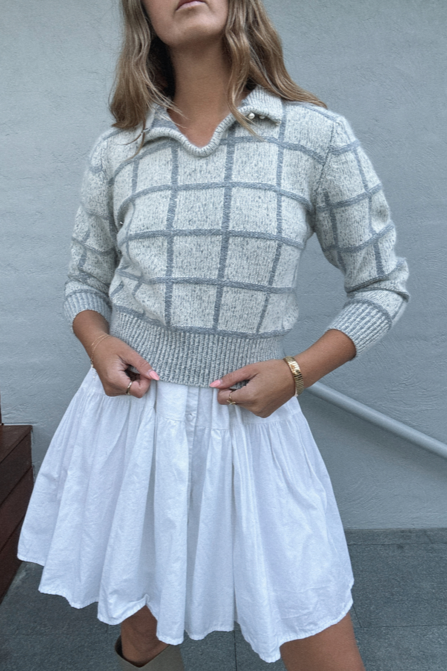 Details: A cozy yet refined knit sweater crafted from a luxurious blend of silk, lambswool, angora, and nylon. This piece features a soft heather grey base adorned with a subtle grid pattern in light blue, offering a timeless yet modern aesthetic. The silhouette is slightly cropped with a ribbed hem and cuffs for a flattering, structured fit, while the relaxed collar adds an effortlessly laid-back touch. Perfectly versatile, it layers beautifully over crisp shirting or pairs effortlessly with high-waisted trousers or denim for a clean, elevated look.