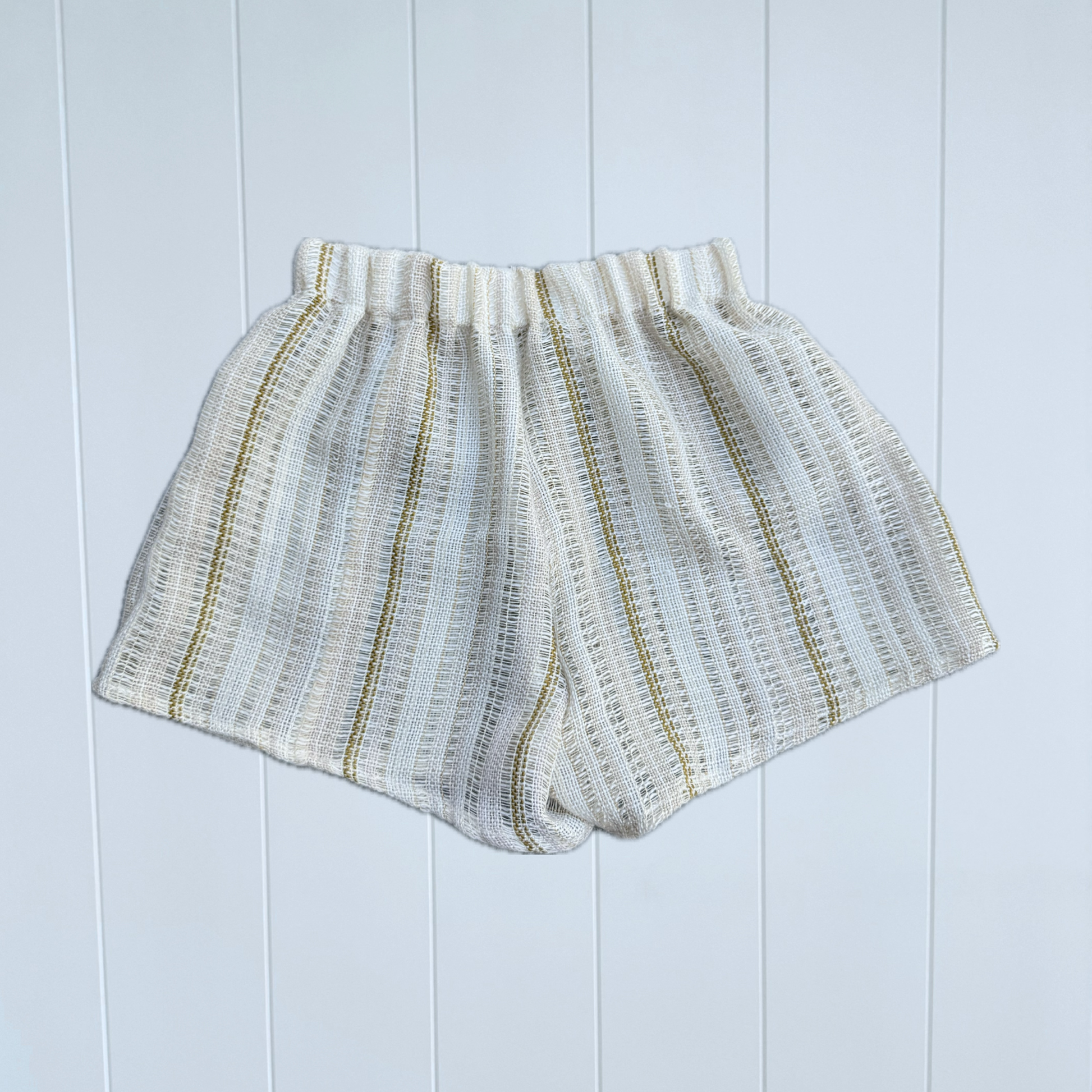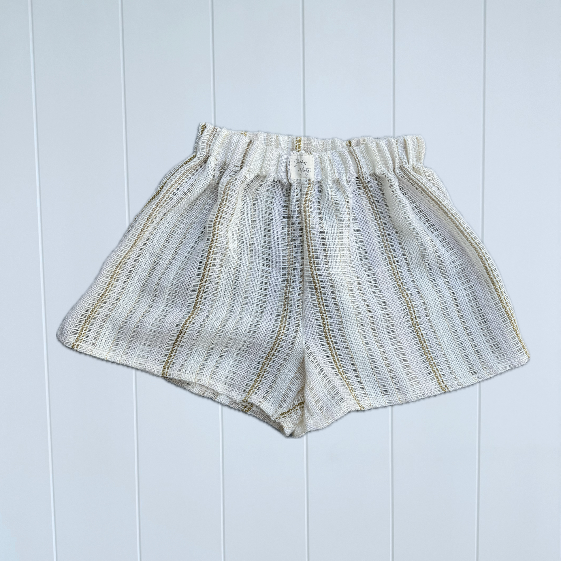 Relaxed elastic waist shorts handcrafted from a reclaimed vintage curtain, soft and sun-washed with a natural, lived-in texture.