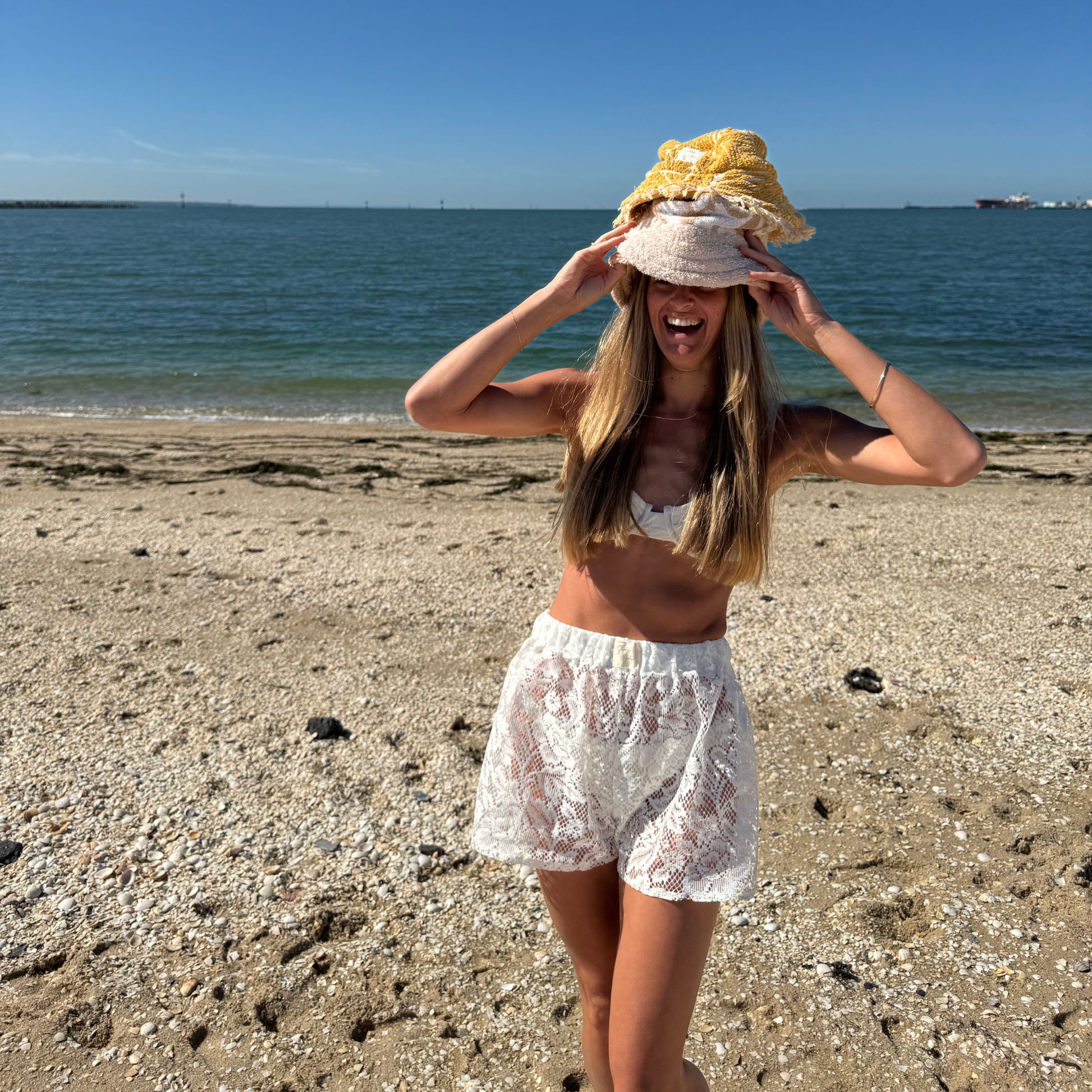 Delicate, lightweight lace shorts handcrafted from a vintage lace tablecloth, designed to be an easy throw-on for the beach or something special to slip into on meaningful mornings.