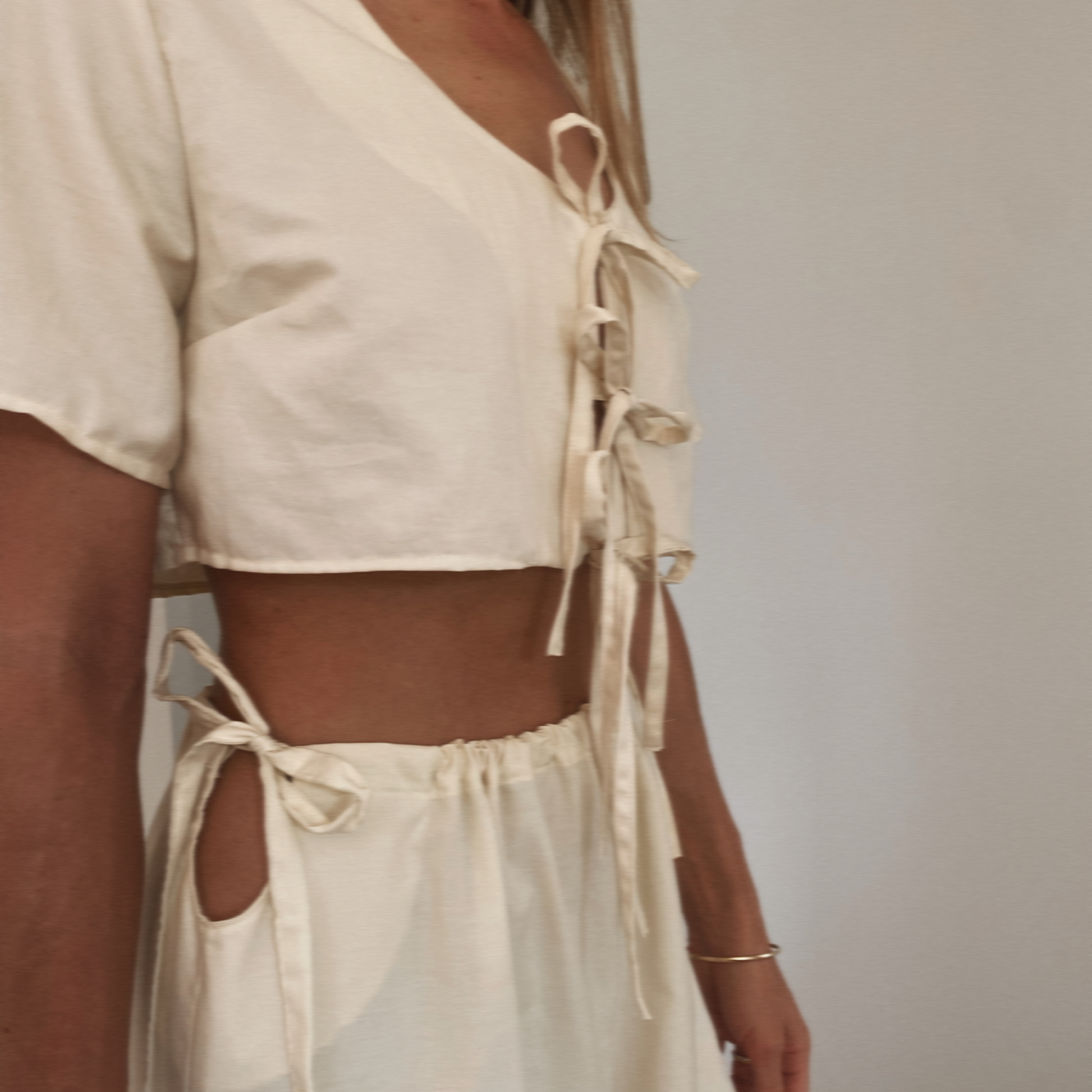 A soft two-piece set handmade from reclaimed fabric, designed for warm days, slow moments, and effortless wear together or apart.