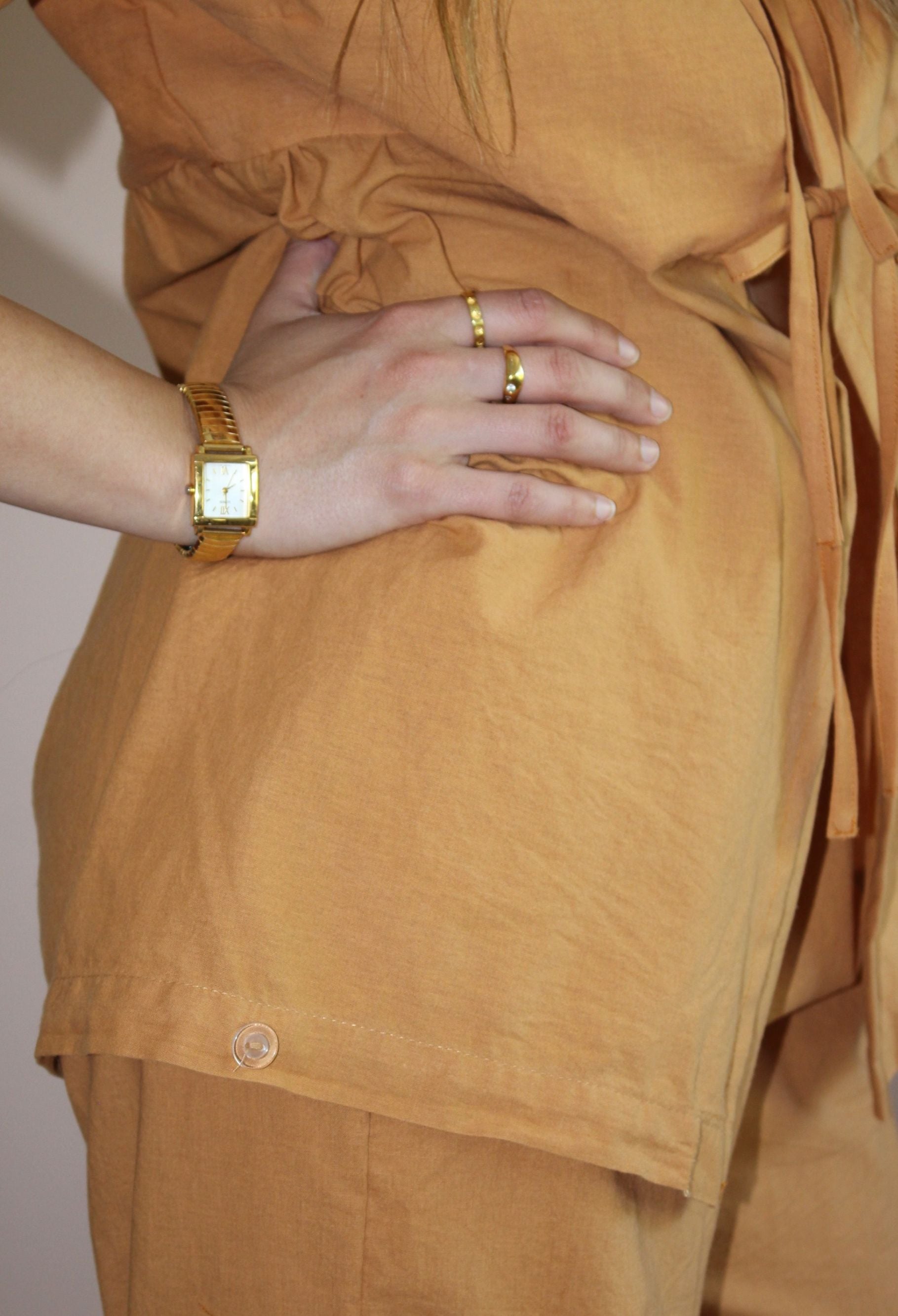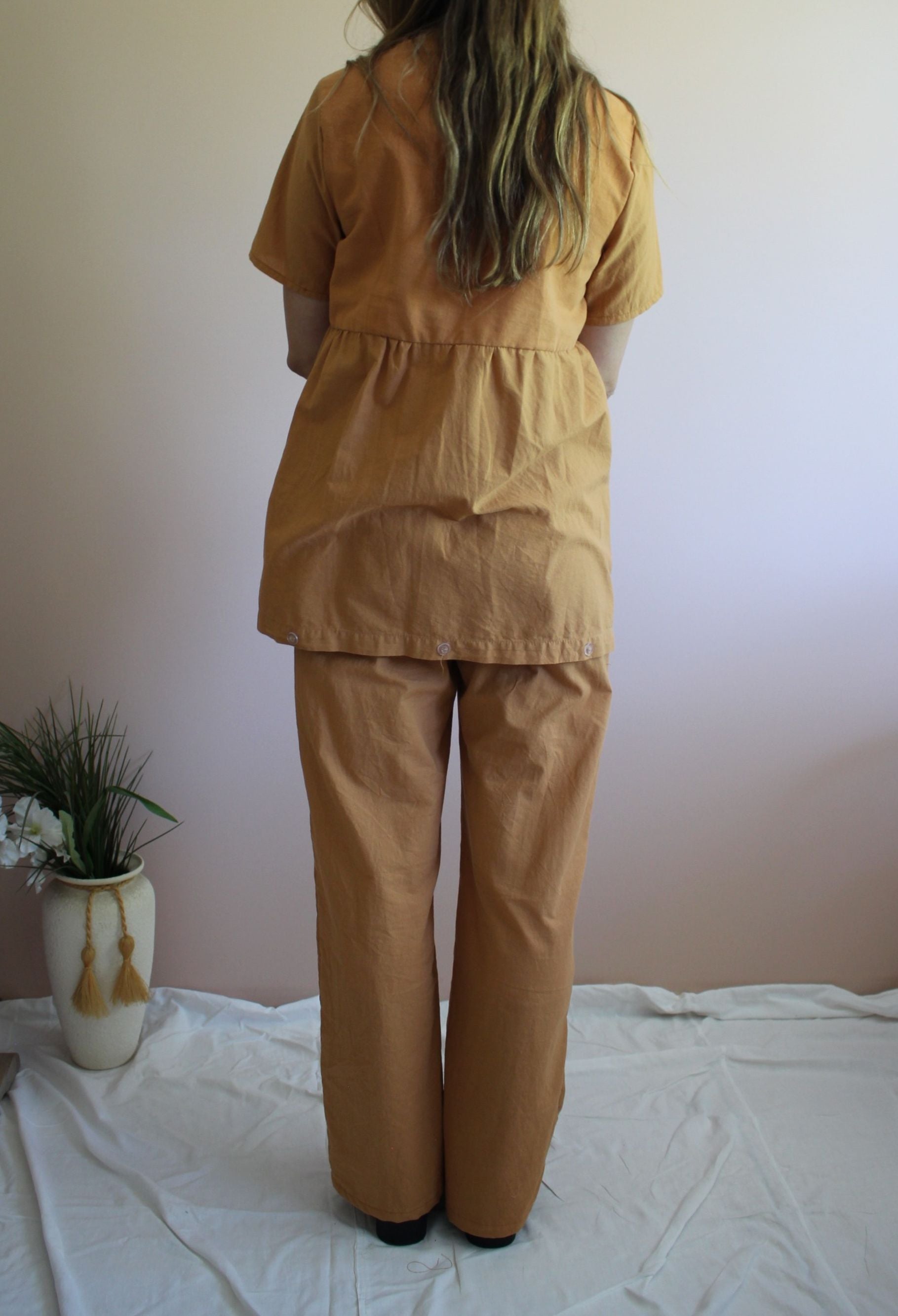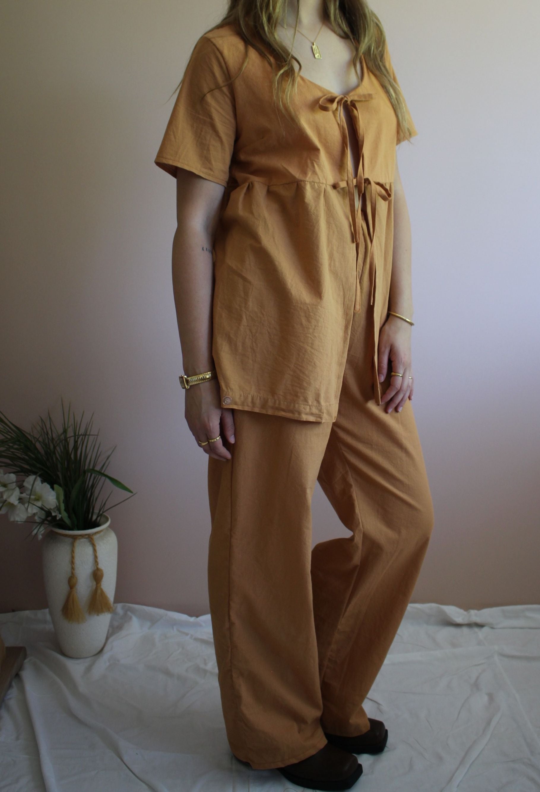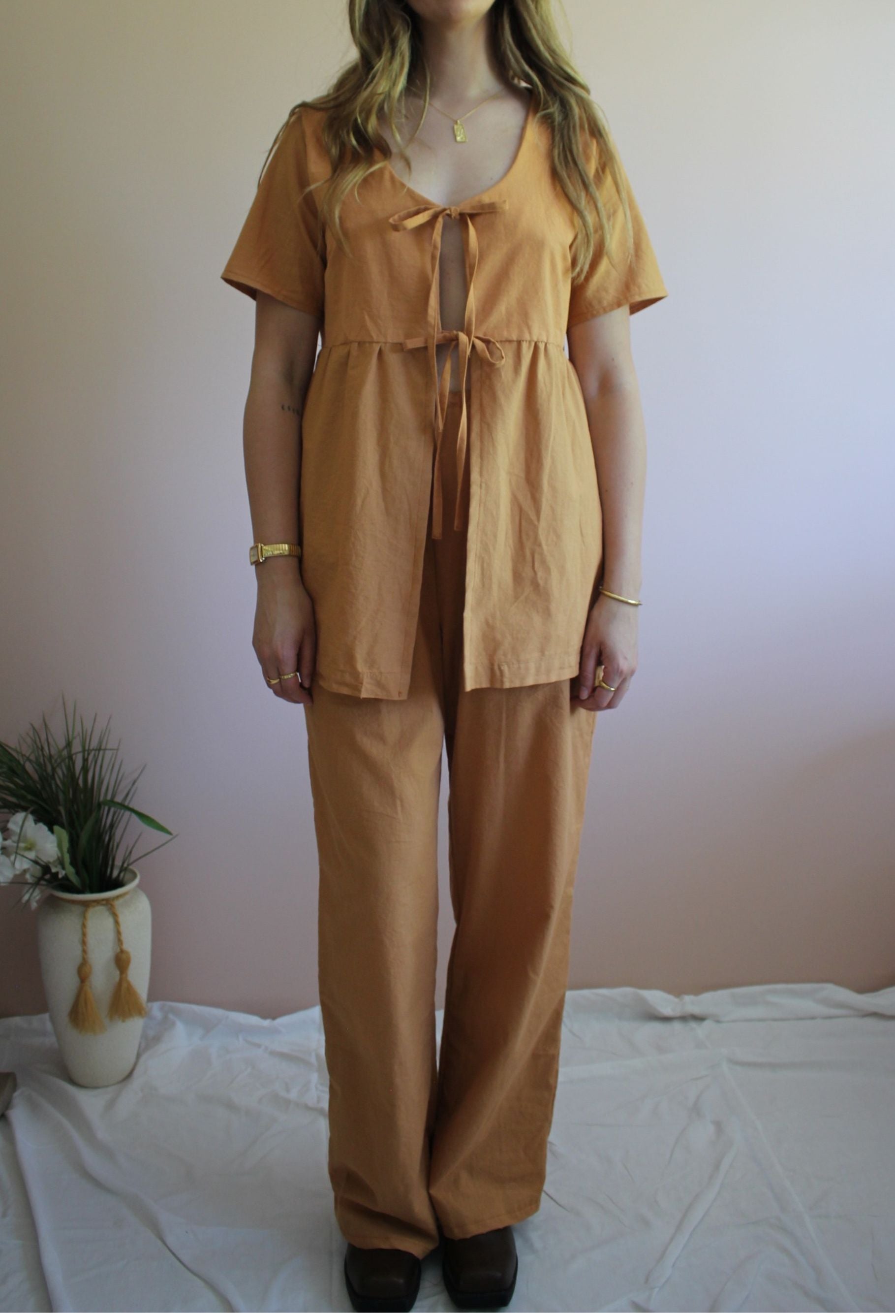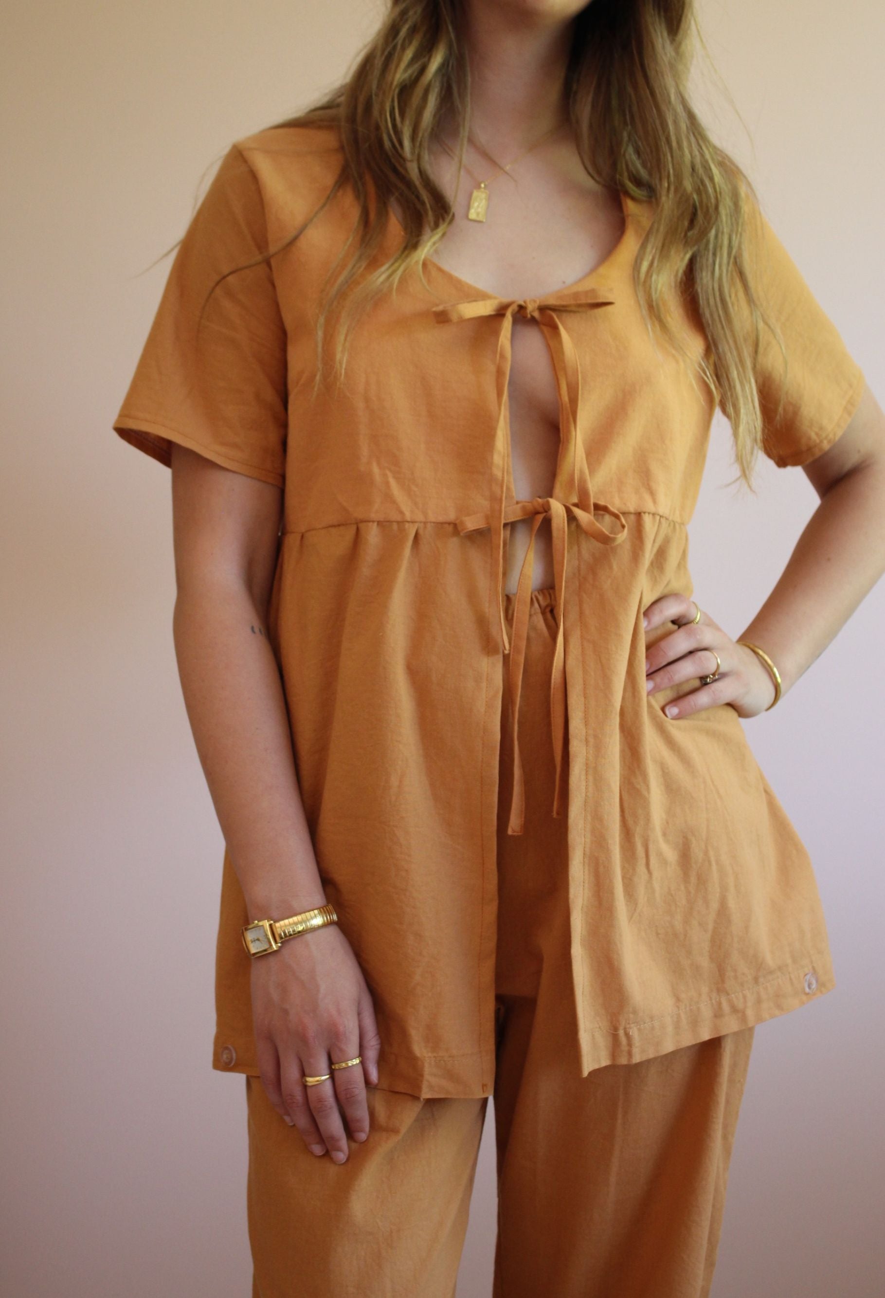 The Sunnie Top features a double tie front, a gathered peplum, and short sleeves. It’s great on its own, layered over a bralette, or paired with a cute tee. * Our Rust Set was made from a doona cover and the bottom half of the peplum has the original buttons that were used to close the doona cover