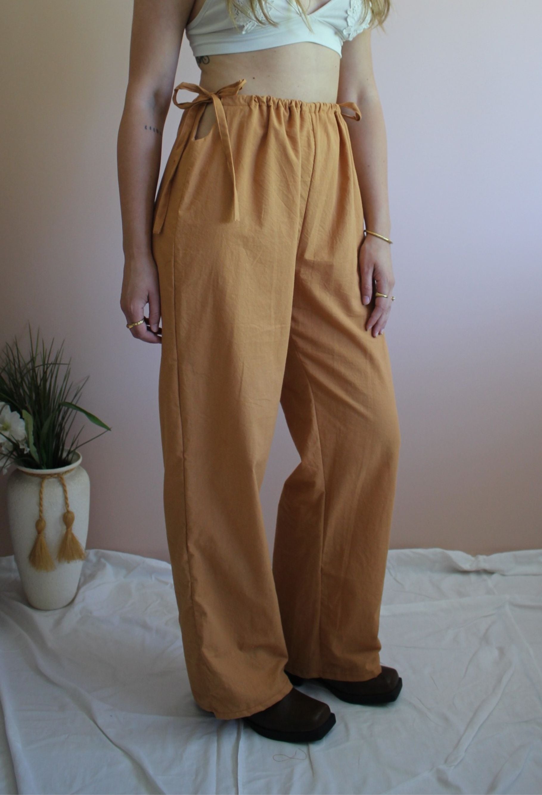 Our Sunnie Pants feature keyhole open sides and are adjustable with the waist ties allowing you to pull them in as much as you need. Complete the look with two charming bows on the sides.