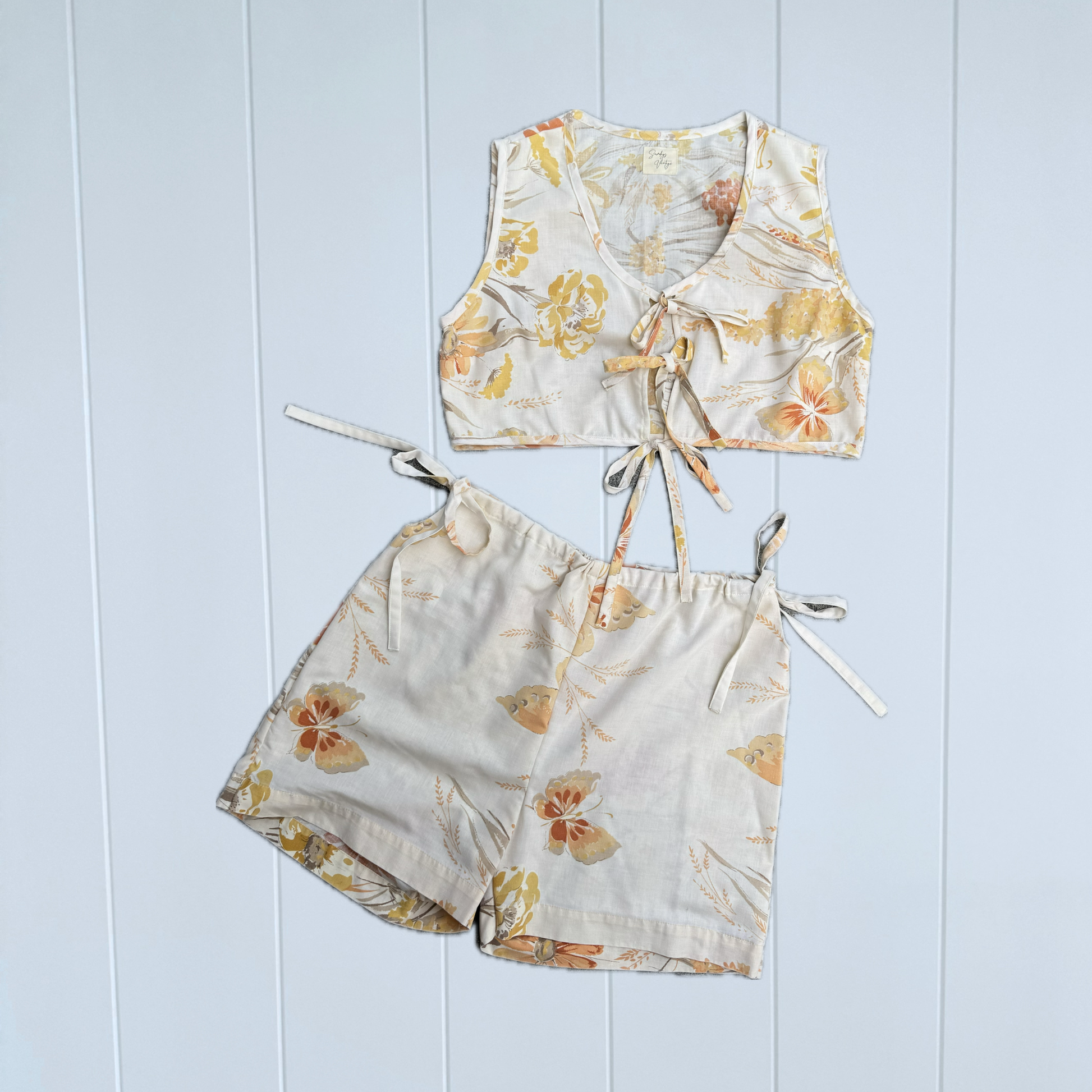 A soft two-piece set handmade from reclaimed fabric, designed for warm days, slow moments, and effortless wear together or apart.