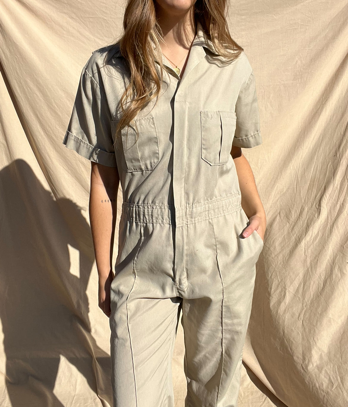 Details: Vintage beige short sleeve coveralls with zipper front closure, some elastic in the waist, functional side and front pockets