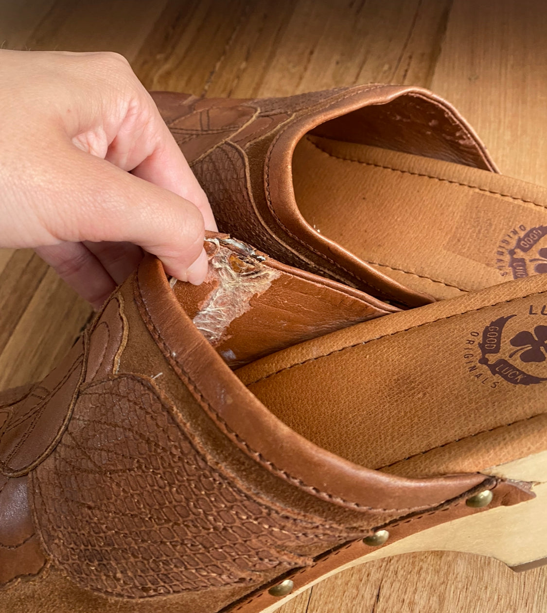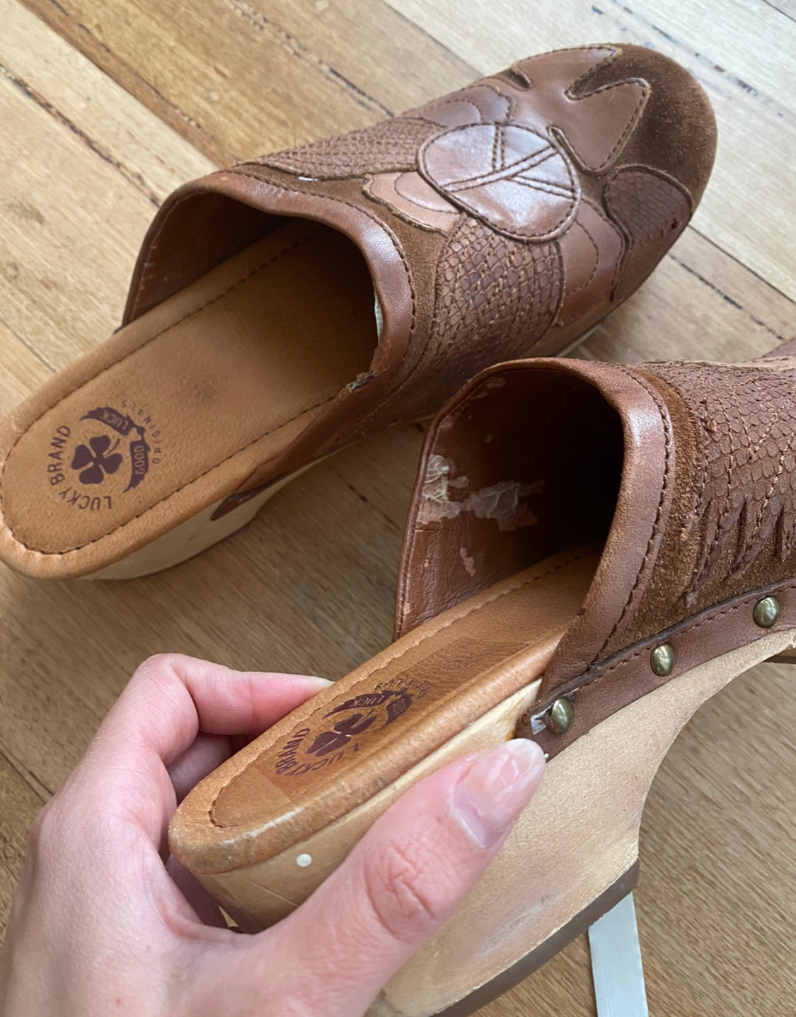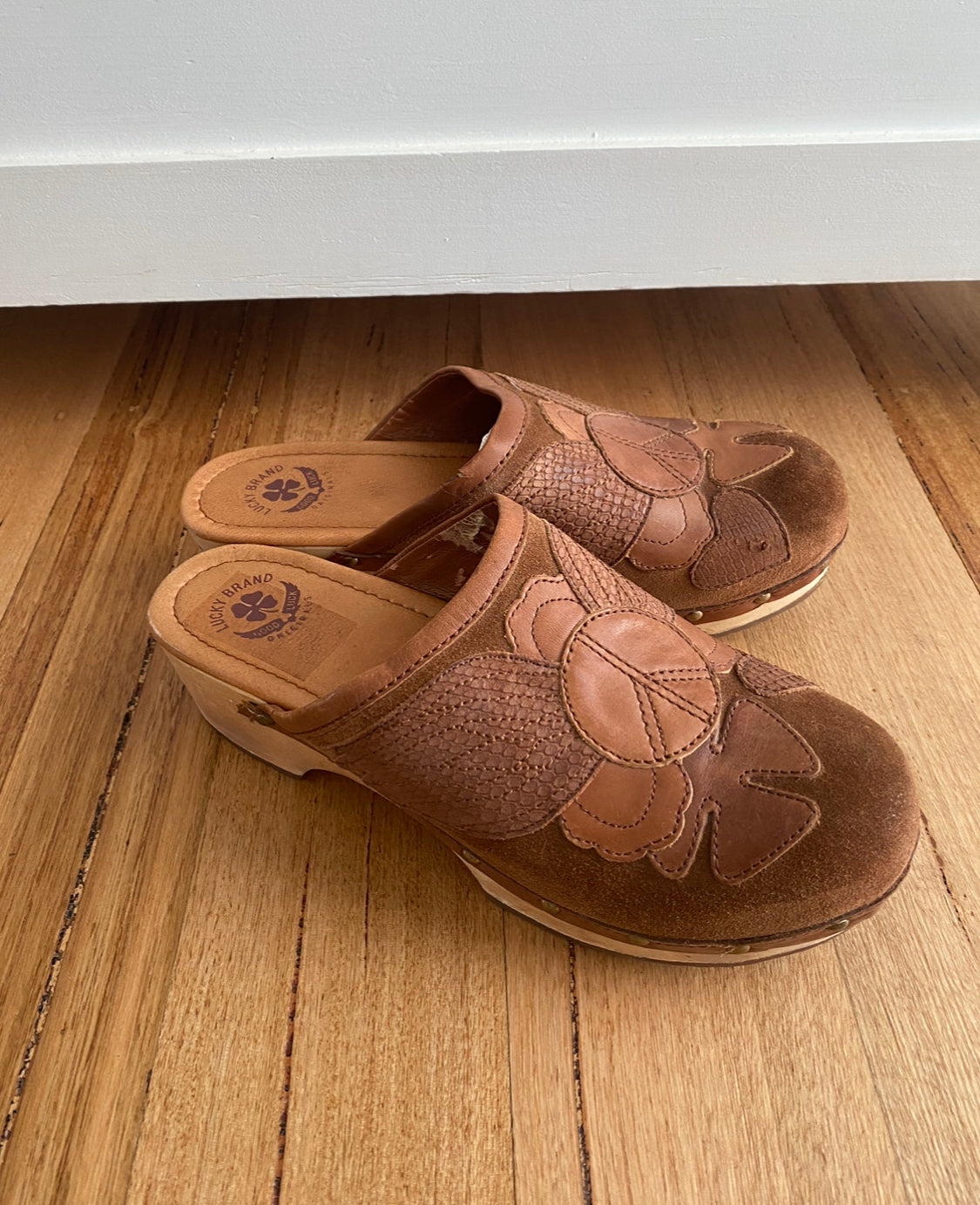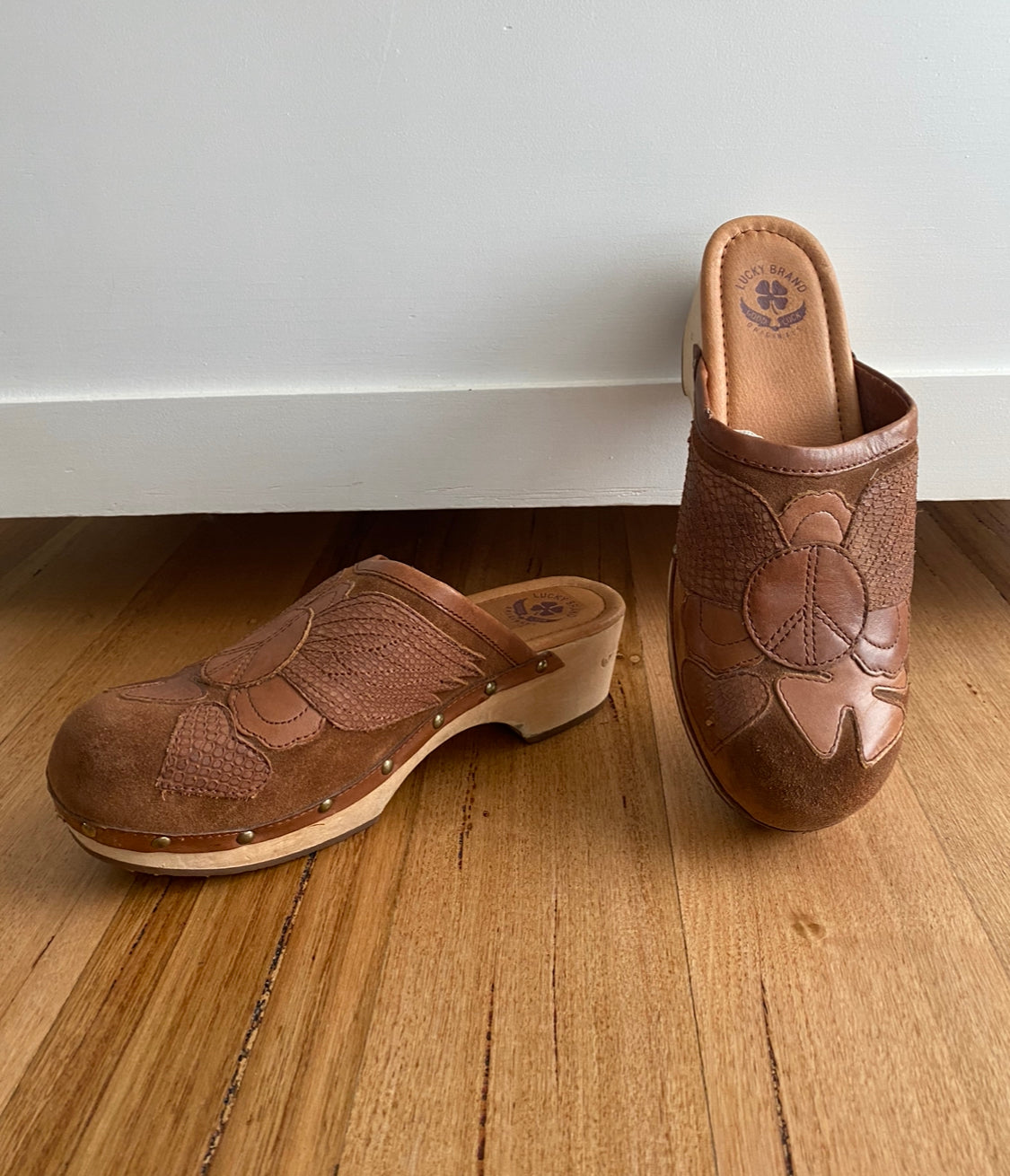 Embroidered Suede Clogs by Lucky Brand. Such a unique find, lovely chocolate suede with beautiful leather patches embroidered and wooden clog heel.