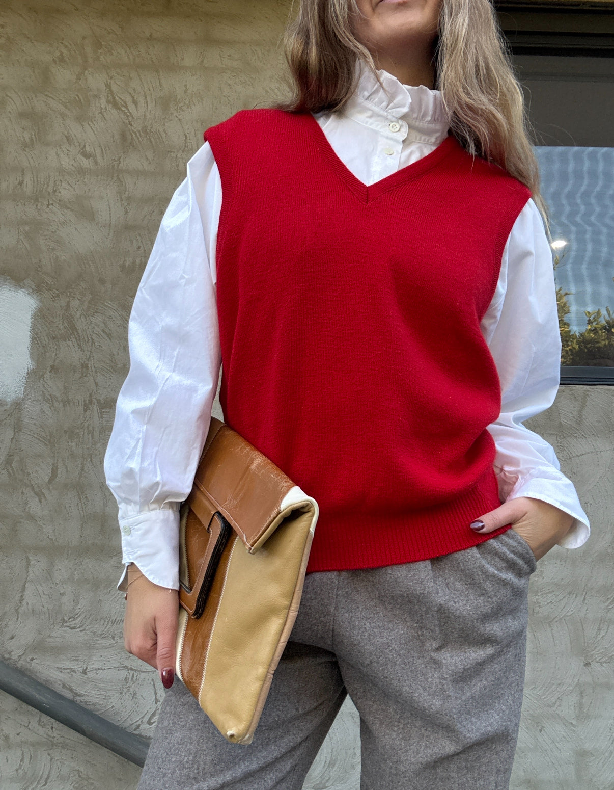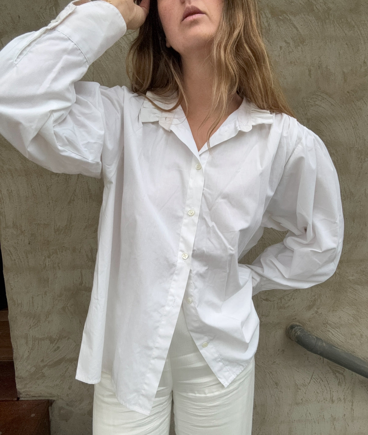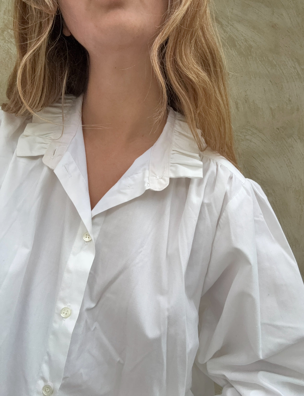 Details: Romantic, tailored, and timeless. This vintage white button-up features a delicate high frill collar, crisp structure, and soft gathering through the back yoke. A versatile piece that pairs perfectly with trousers, denim or layered under knits.
