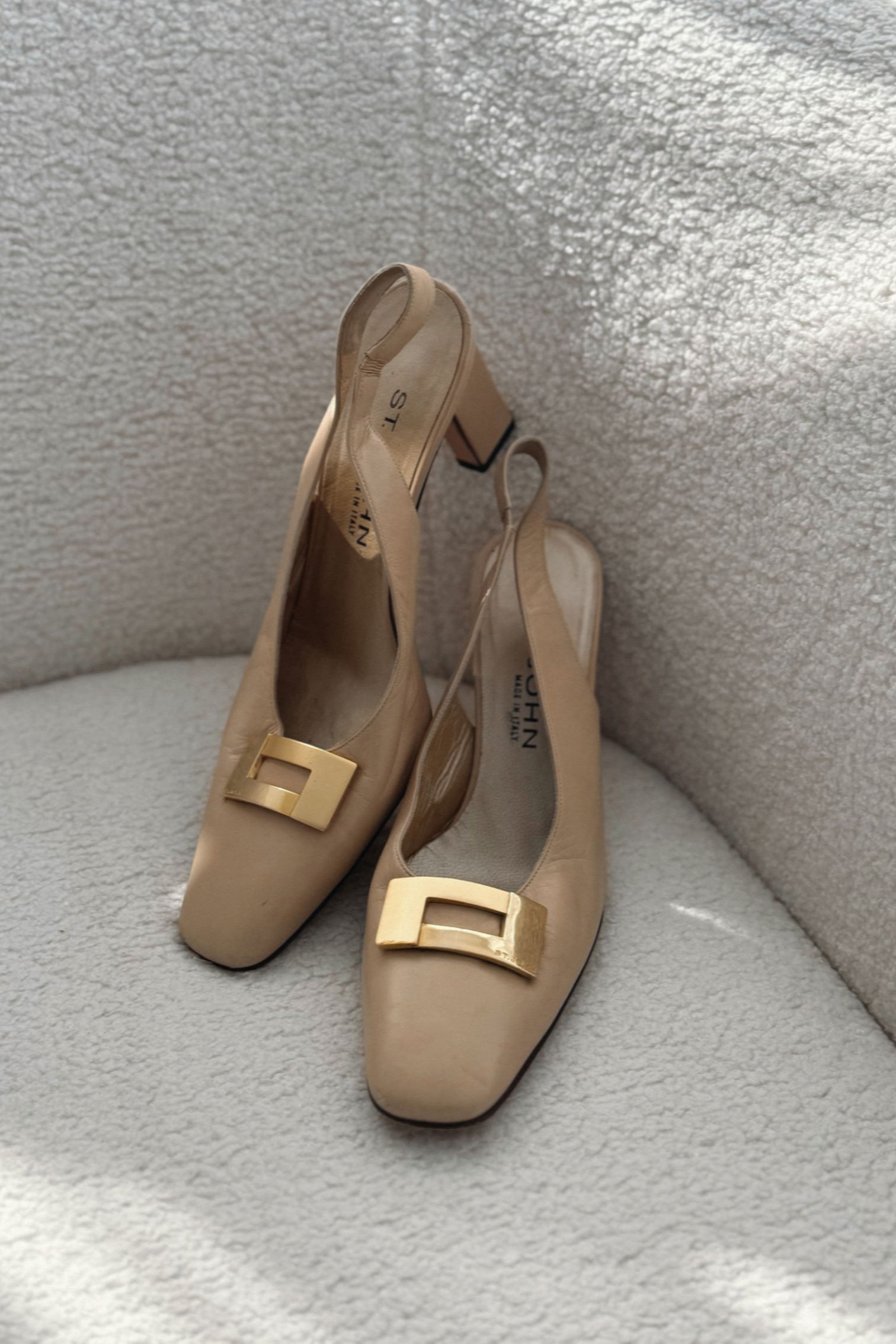 Details: Elegant and refined — these nude leather slingback heels by St. John are a study in understated luxury. Crafted in Italy from smooth leather with a structured square toe and a polished gold-tone buckle, they strike the perfect balance between timeless sophistication and everyday versatility. The mid-height block heel offers subtle elevation with all-day comfort, making them a chic choice from desk to dinner.