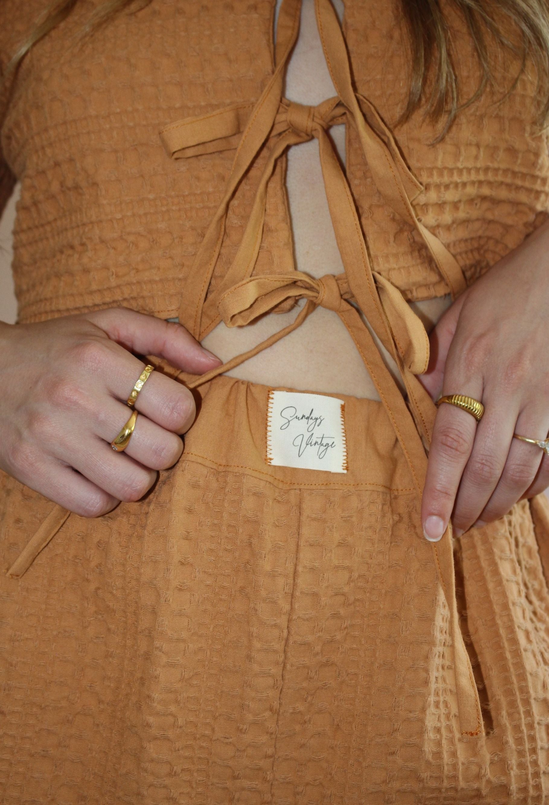 The Waffle Top features a triple tie front, and short sleeves. It’s great on its own, layered over a bralette, or paired with a cute crop.