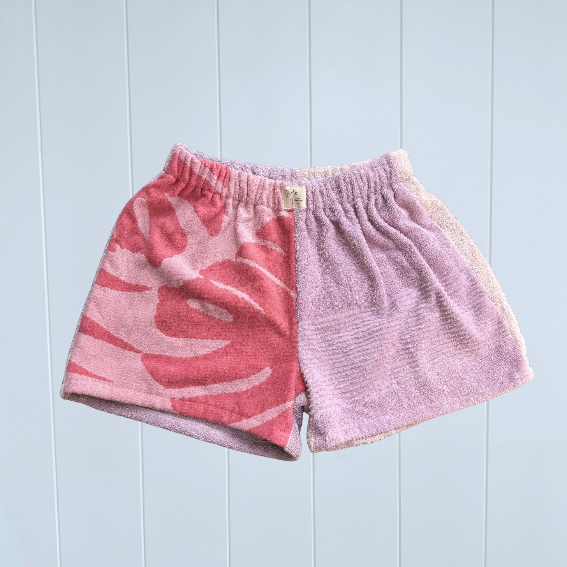 Each pair is thoughtfully cut and sewn by hand in my Melbourne home studio, using carefully selected vintage and preloved towelling. From sourcing to stitching, every towel is used as fully as possible — with leftover scraps transformed into matching bags, hats, and accessories to minimise waste.