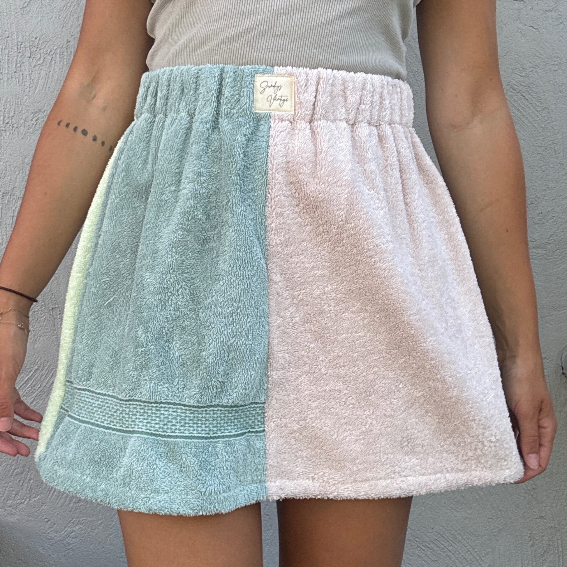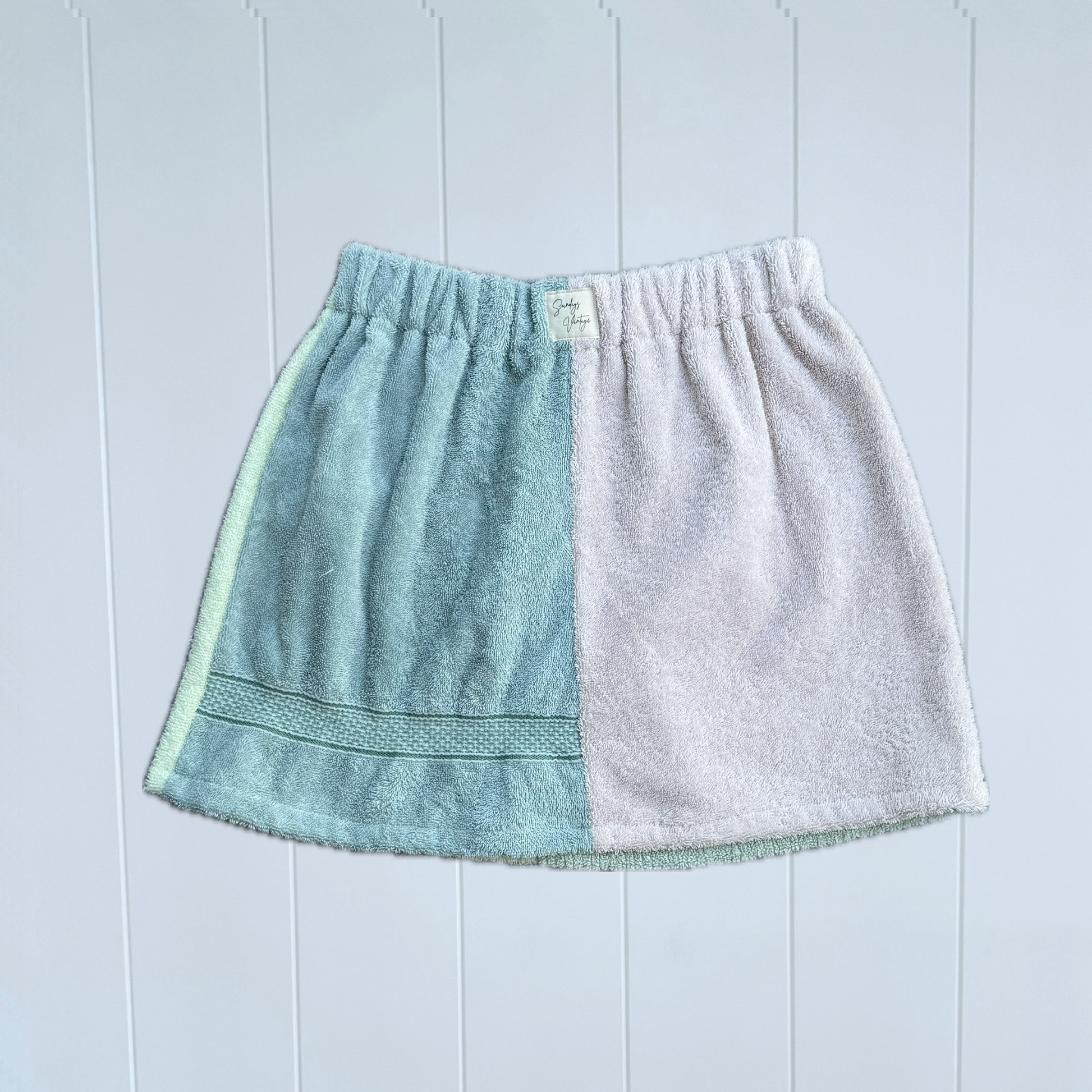 Each skirt is thoughtfully cut and sewn by hand in my Melbourne home studio, using carefully sourced vintage and preloved towelling. From start to finish, every towel is used as fully as possible — with leftover fabric transformed into patchwork bags, hats, and accessories to minimise waste.